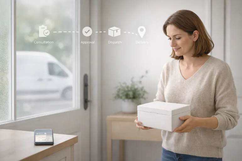 The consultation is straightforward - a questionnaire that takes ten to fifteen minutes, with no ambiguity about what information is needed. Clinical review happens on the same day, often within a few hours. The pharmacy dispatches the same afternoon, and the customer receives a tracking notification confirming it is on the way. Medication arrives the following morning, properly packaged and cold.