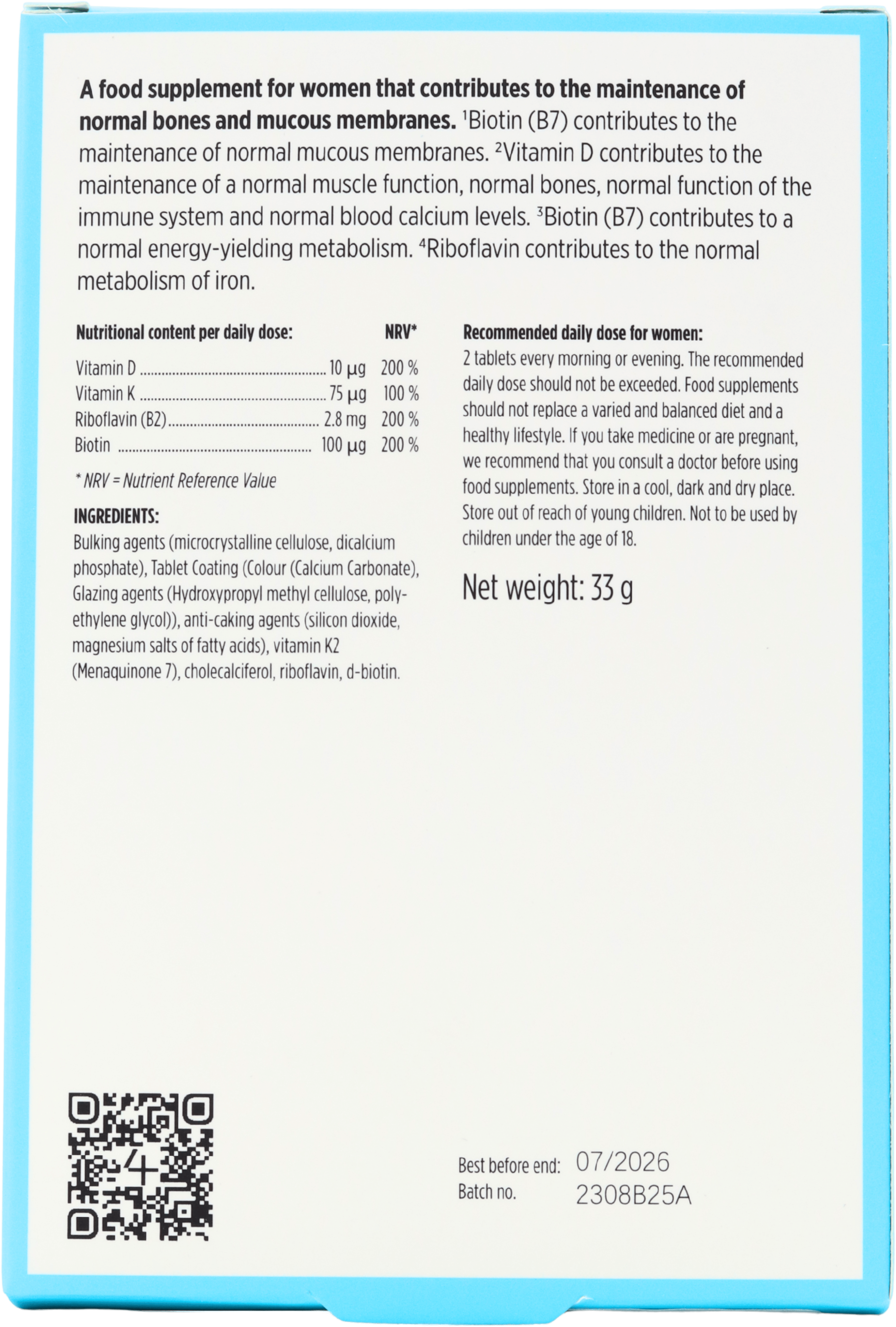 - Bone and muscle health: Contains vitamin D3 and vitamin K2, which support normal bones, muscle function and healthy blood calcium levels, making it a smart choice if you want to care for your skeleton and mobility as you age.