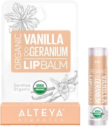 Alteya’s Organic Lip Balm Vanilla & Geranium is designed to lock in moisture and promote lip elasticity and suppleness.