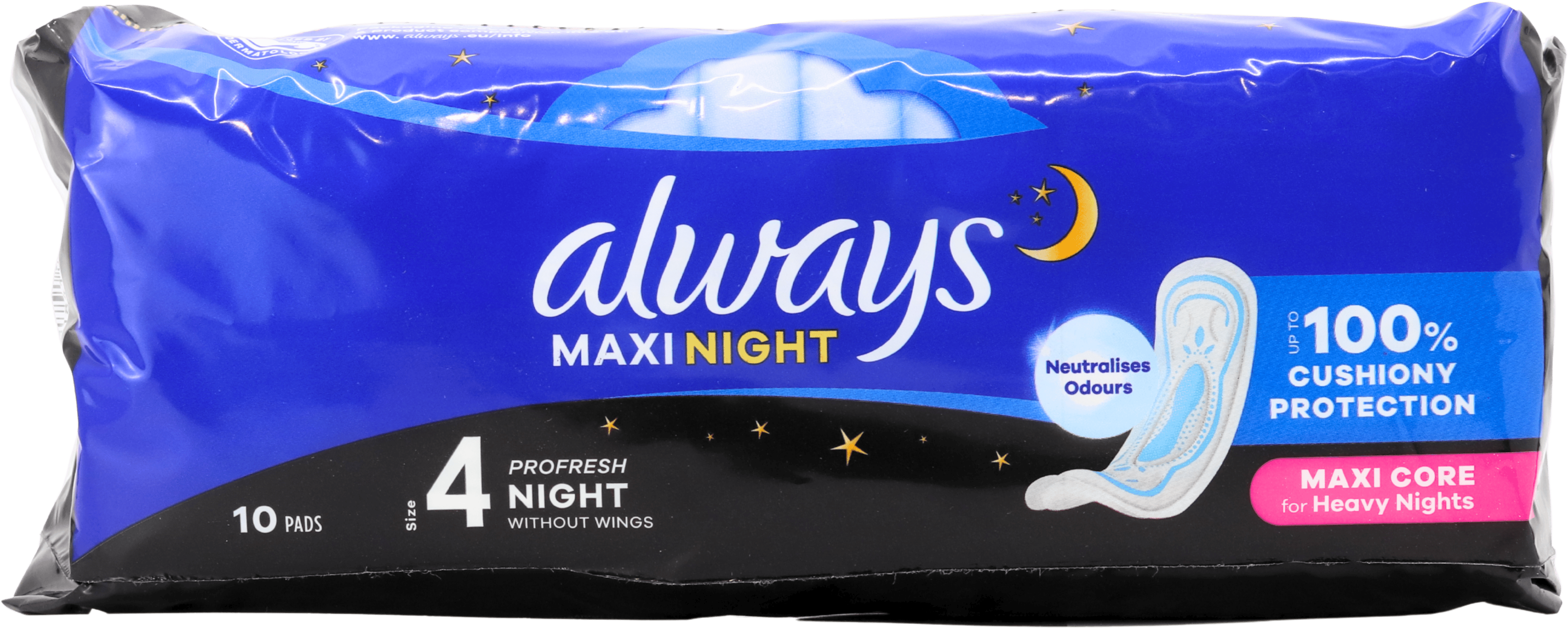 Always Maxi Night ProFresh Pads are designed to offer enhanced nighttime protection. Features like odour control, a contoured fit, and a super absorbent core help provide dryness, comfort, and peace of mind during sleep, which is especially helpful for those dealing with a heavier flow.