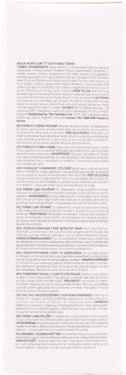 Anua Heartleaf 77% Soothing Toner 250ml is a calm, simple step for daily skin care. It holds 77% heartleaf extract to help ease red, hot, or spot prone skin. This leaf has shown soothing and anti-red properties in testing. The light, water-like feel suits oily, dry, mixed, and weakened skin, including acne-prone skin. Gentle humectants help draw in moisture so skin feels soft, plump, and more even. As a result, this toner helps support clear pores, fewer breakouts, and a healthy skin barrier.
