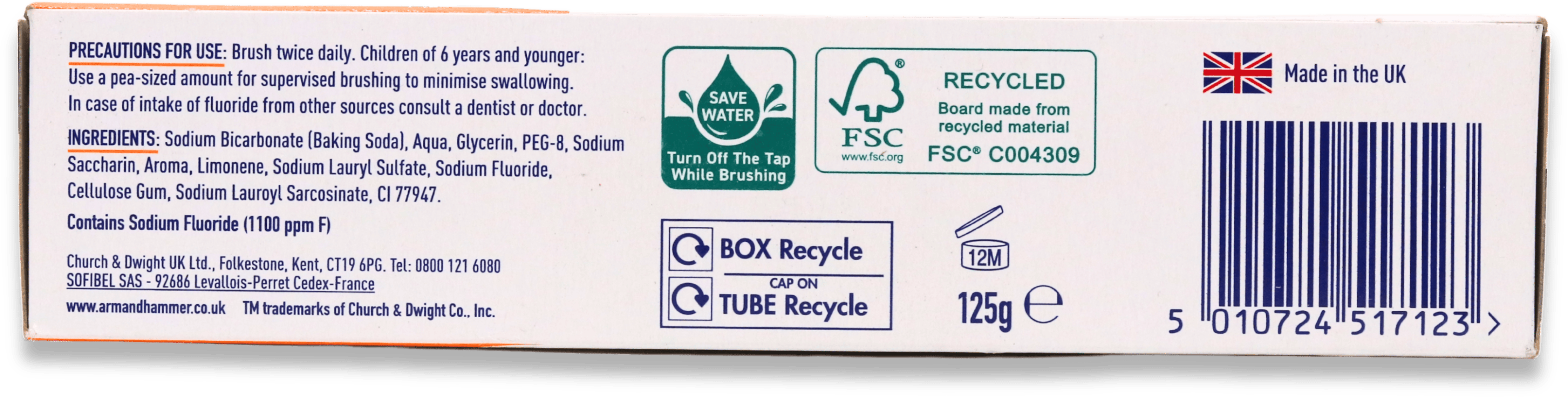 Sodium Bicarbonate (Baking Soda), Aqua, Glycerin, PEG-8, Sodium Saccharin, Aroma, Limonene, Sodium Lauryl Sulfate, Sodium Fluoride, Cellulose Gum, Sodium Lauroyl Sarcosinate, CI 77947, Contains Sodium Fluoride (1100 ppm F)