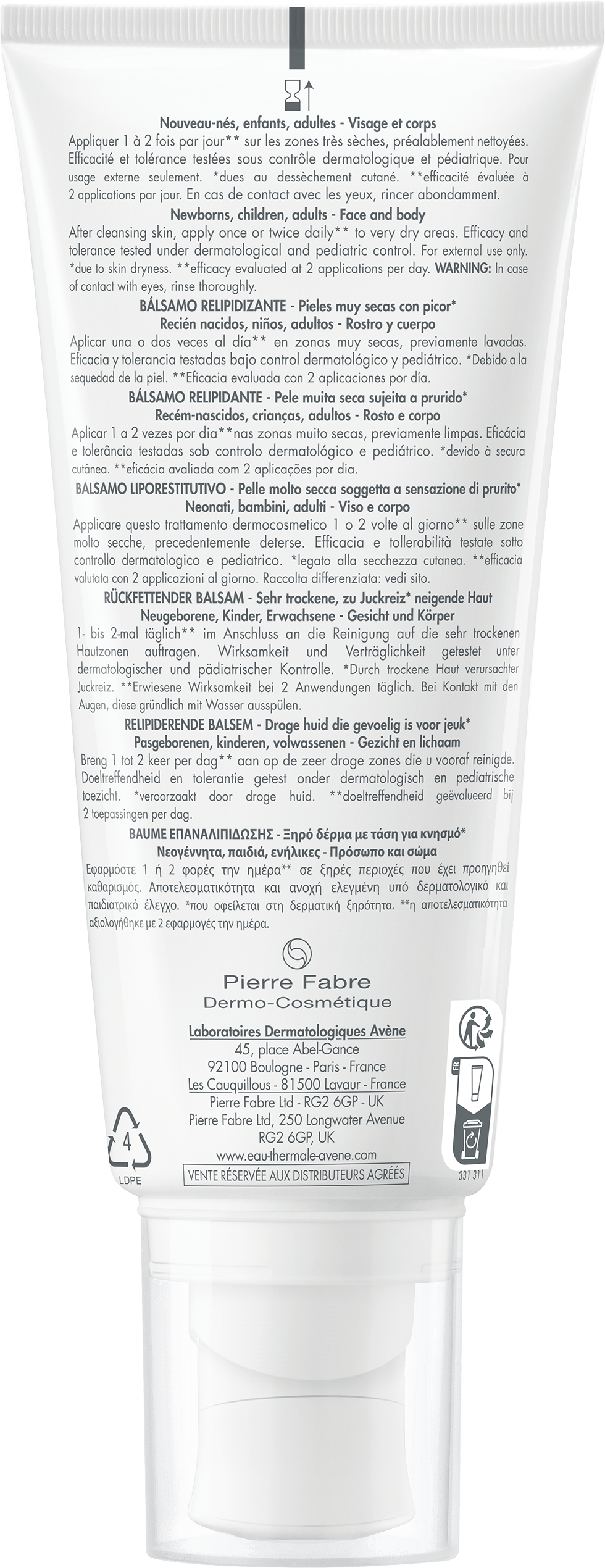 Avene Thermale Spring Water (Avene Aqua). Mineral Oil (Paraffinum Liquidum). Glycerin. Caprylic/Capric Triglyceride. Peg-12. Oenothera Biennis (Evening Primrose) Oil (Oenothera Biennis Oil). Glyceryl Stearate. Myreth-3 Myristate. Peg-100 Stereate. Polyacrylate-13. Aquaphilus Dolomiae Extract. Arginine. Citric Acid. Evening Primrose Oil :Palm Oil Aminopropanediol Esters. Glycine. Polyosibutene. Polusorbate 20. Sodium Acetate. Sorbitan Osistearate. Tocopherol. Water (Aqua).
