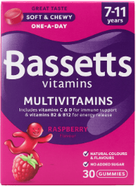 Bassetts 7-11 Years Multivitamins 30 Gummies are soft and chewy raspberry-flavoured supplements designed specifically for children aged seven to eleven. Each daily gummy delivers 11 essential nutrients tailored to support active youngsters during this crucial development phase. These multivitamins contain no added sugar whilst providing natural colours and flavours.