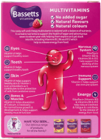 Sweeteners (Maltitol syrup, Sorbitol, Sucralose), Gelatine (Bovine), L-ascorbic acid (Vitamin C), DL-alpha-tocopheryl acetate (Vitamin E), Zinc citrate, Colour (Anthocyanins), Raspberry flavouring, Dexpanthenol [Pantothenic acid (Vitamin B5)], Acid (Malic acid), Glazing agent (Carnauba wax), Riboflavin 5-phosphate sodium (Vitamin B2), Pyridoxine hydrochloride (Vitamin B6), Retinyl palmitate (Vitamin A), Pteroylmonoglutamic acid (Folic acid), D-biotin, Cholecalciferol (Vitamin D), Cyanocobalamin (Vitamin B12).