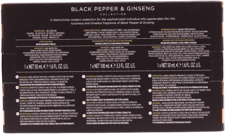 The black pepper and ginseng blend offers a unique, bold scent with spicy notes and a rich sandalwood base, providing a modern, masculine aroma that lingers longer than most standard men's grooming sets.