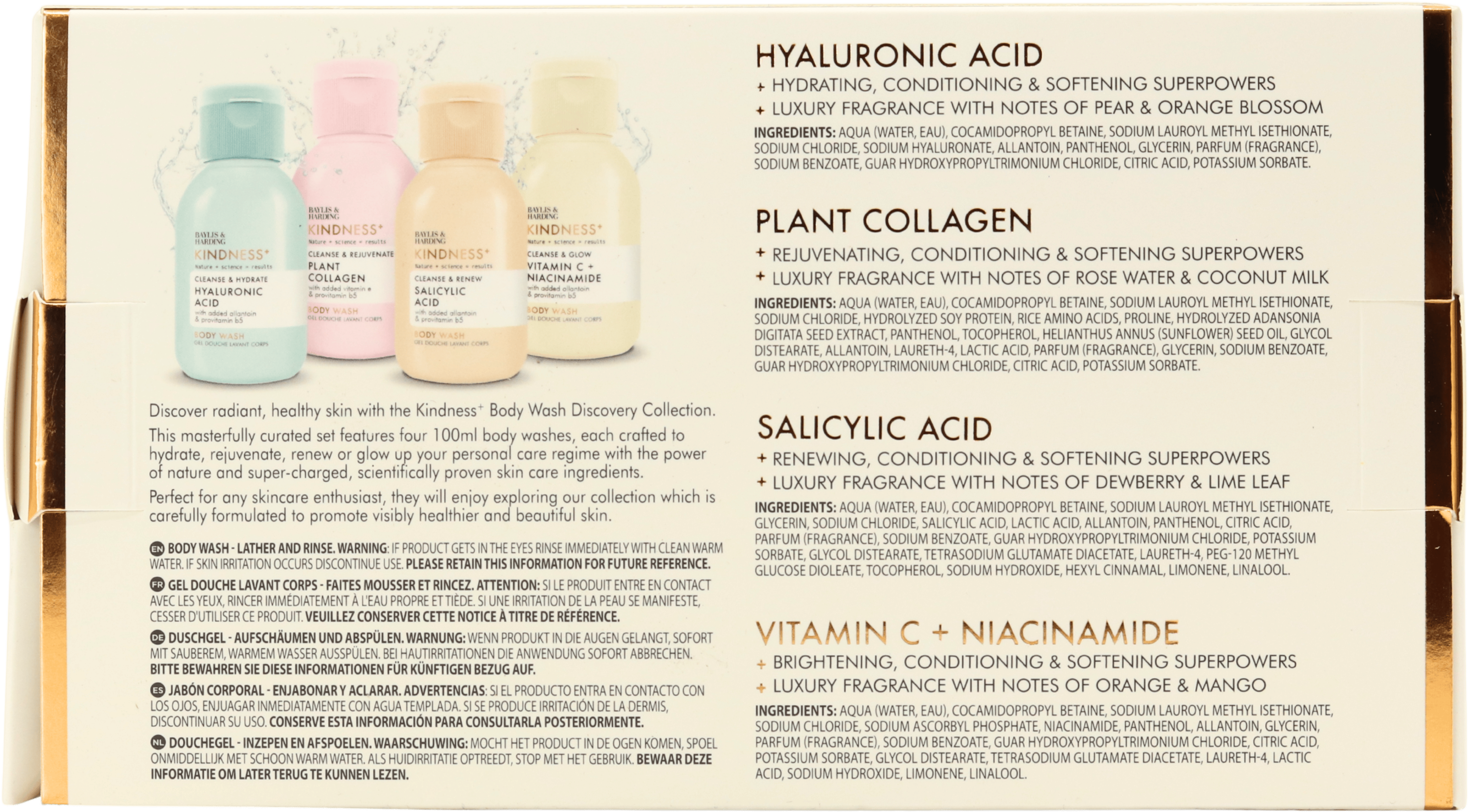 - Thoughtfully curated 4-piece set: Contains 100 ml Hyaluronic Acid body wash, 100 ml Plant Collagen body wash, 100 ml Salicylic Acid body wash and 100 ml Vitamin C + Niacinamide body wash, giving you a complete discovery routine or ready-made gift.