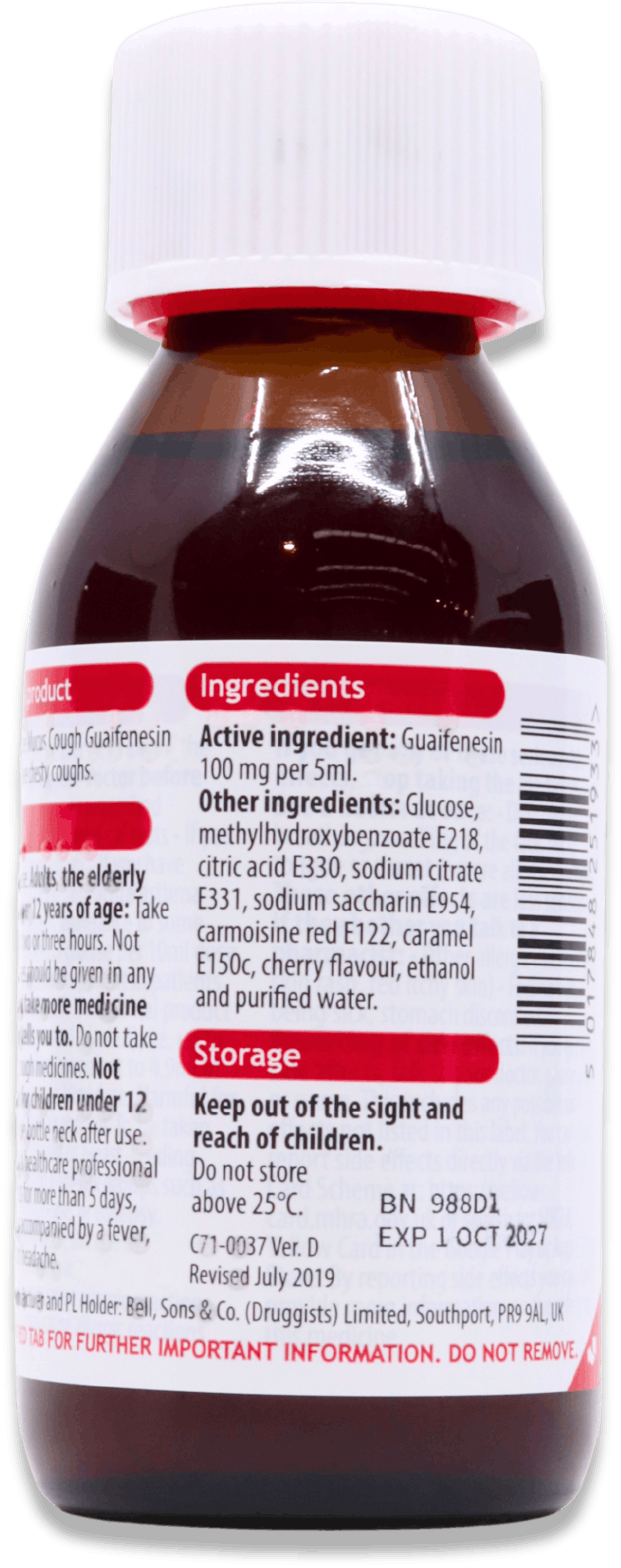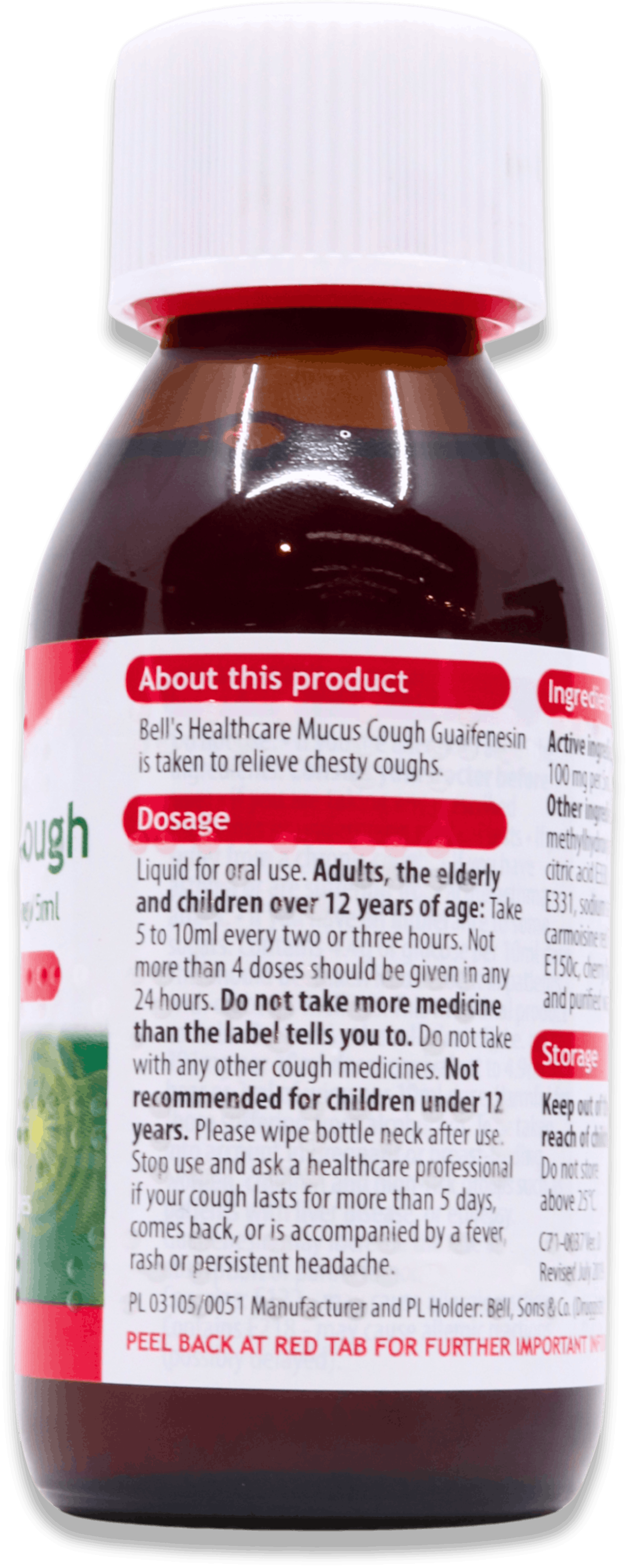 Bell's Mucus Cough Solution 100ml helps ease chesty coughs fast. Suitable for adults and children aged 12 and above, it contains guaifenesin. This ingredient thins mucus, making it easier to cough up phlegm. As a result, breathing becomes clearer. Bell's Mucus Cough Solution is a trusted choice during colds or flu.