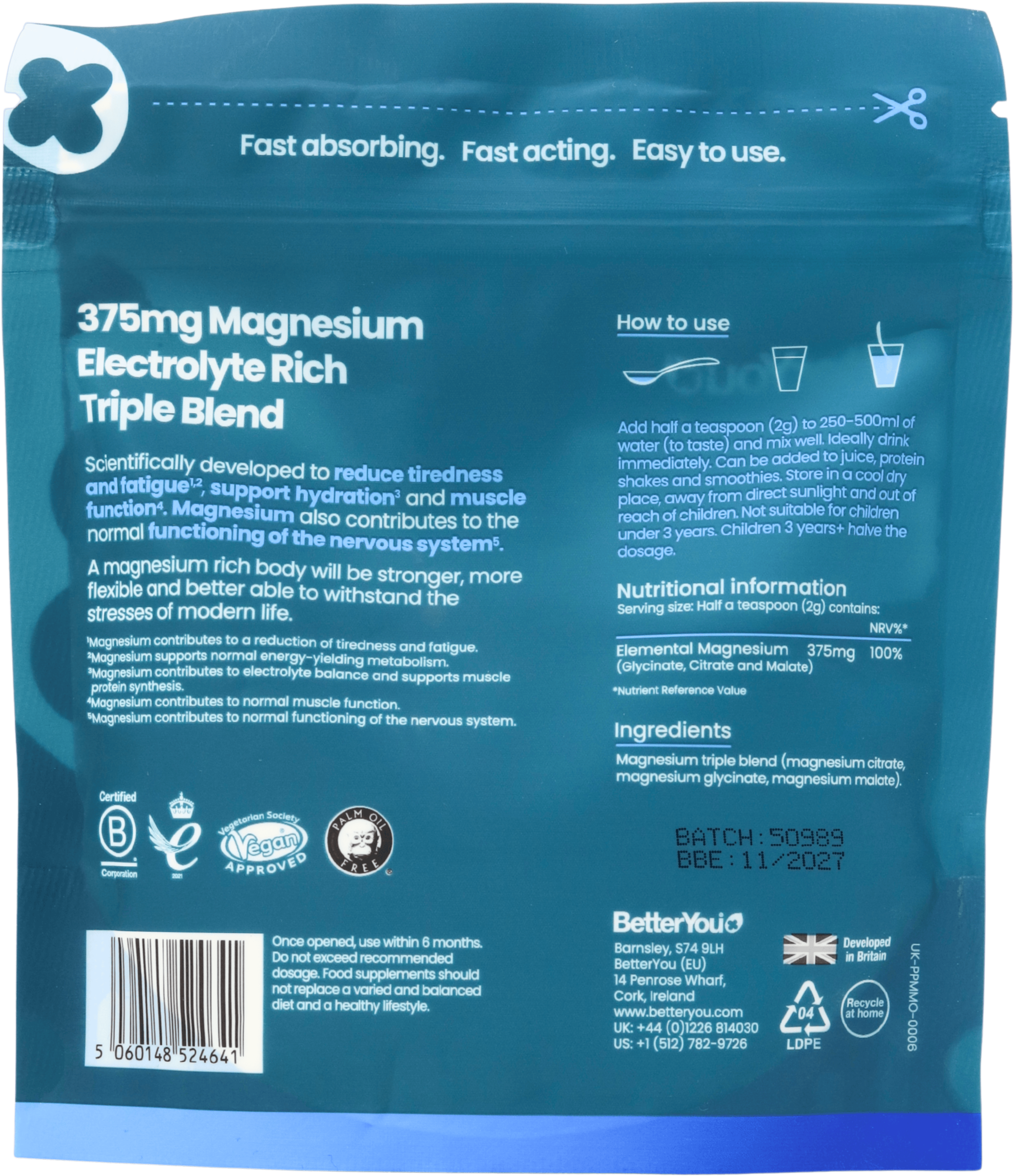BetterYou Magnesium Max Original Unflavoured Powder 120g is a high-strength magnesium supplement designed for anyone looking to support energy levels, muscle function, nervous system health and overall wellbeing with an easy-to-mix, flavour-free drink. People with active lifestyles, busy schedules, disturbed sleep or low dietary magnesium intake can benefit from its highly absorbable triple-blend formula. Each serving provides 375mg of optimally absorbable elemental magnesium from glycinate, citrate and malate, helping to reduce tiredness and fatigue while supporting normal muscle performance and electrolyte balance. Research suggests that well-absorbed forms of magnesium, including bisglycinate, may help improve sleep quality in adults with poor sleep, highlighting the value of bioavailable magnesium in everyday supplementation.