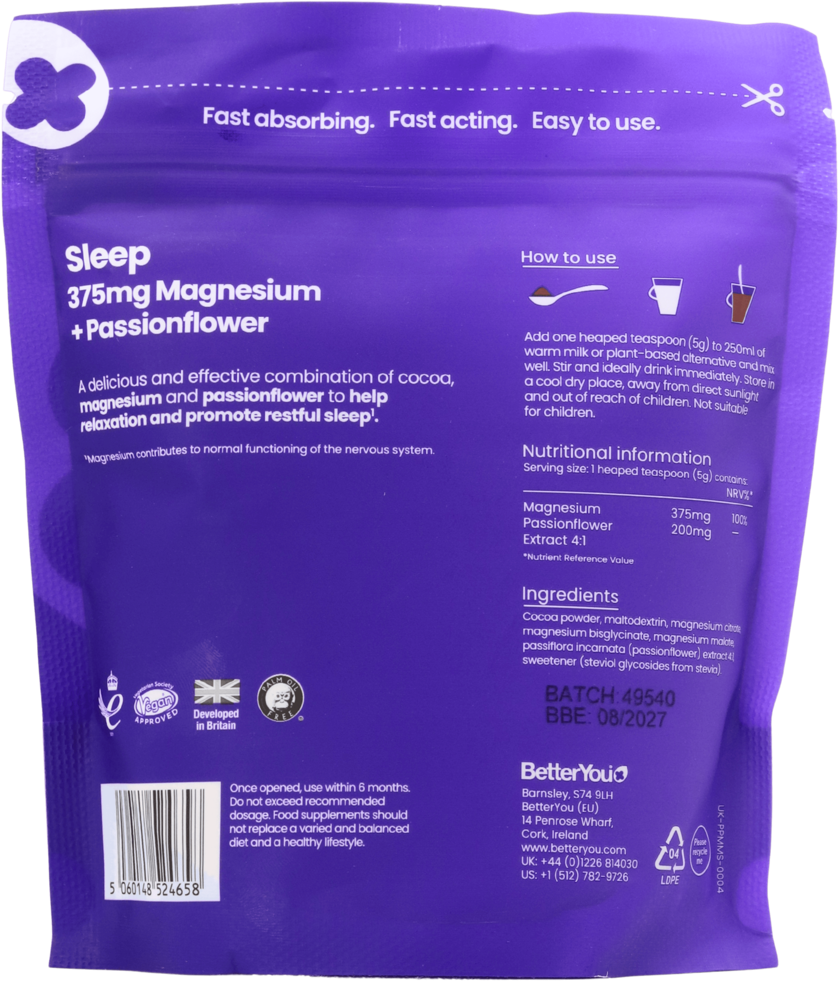 BetterYou Magnesium Max Sleep Powder 160g is a comforting hot chocolate-style evening drink designed for adults who want to unwind, relax tense muscles and support deeper, restorative sleep. This 3-in-1 magnesium blend combines highly absorbable bisglycinate, citrate and malate with passionflower extract and natural cocoa, helping to calm the nervous system and ease away the stresses of the day. Magnesium is well known for its role in reducing tiredness and fatigue, supporting normal psychological function and contributing to healthy muscle function, making this drink especially useful for those who feel wired yet exhausted at bedtime. The sugar-free, vegan formula dissolves easily in warm milk or plant-based alternatives, creating a soothing night-time ritual that fits seamlessly into a modern lifestyle.