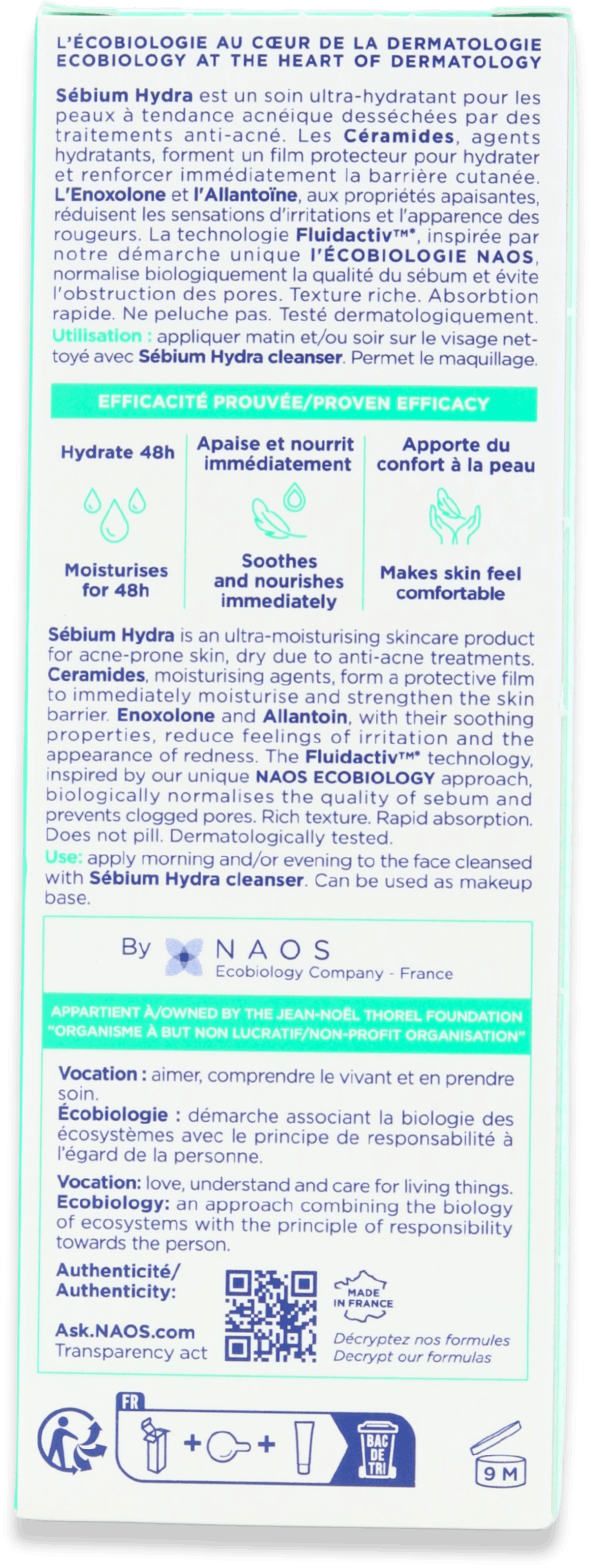 Bioderma Sébium Hydra Moisturiser 40ml helps skin that feels dry, tight, and sore. Skin under acne care often peels, stings, and shows red patches that need calm and care. This cream soothes stressed, blemish prone skin while it helps guard the skin’s barrier. Glycerin and ceramides draw and lock in water, so skin stays soft for many hours. Enoxolone and allantoin help ease flare ups and cut down on redness and marks. Light yet rich, it feels smooth under make up and will not clog or block pores.