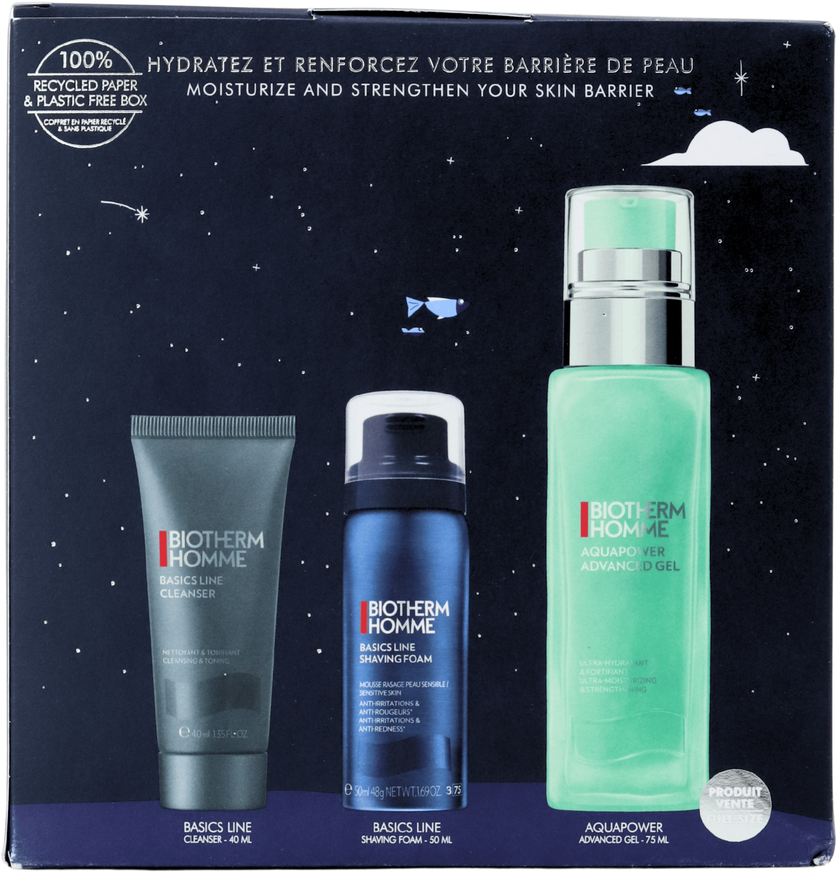 Biotherm Homme A Holiday Full of Wonders Gift Set includes Biotherm Homme Basics Line Cleanser 40ml, Basics Line Shaving Foam 50ml and Aquapower Advanced Gel 75ml. This combination helps create a straightforward routine that cleanses, hydrates and refreshes the skin throughout the day.