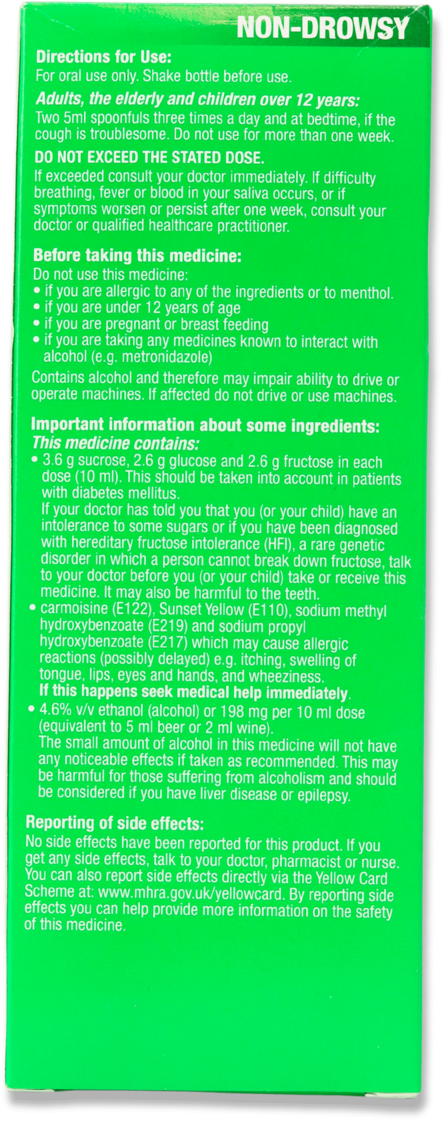 Consult a pharmacist or doctor before use if taking other medicines, especially those that interact with alcohol or medications that can affect the liver. Avoid taking other cough or cold remedies at the same time unless advised, to prevent accidental duplication of ingredients.