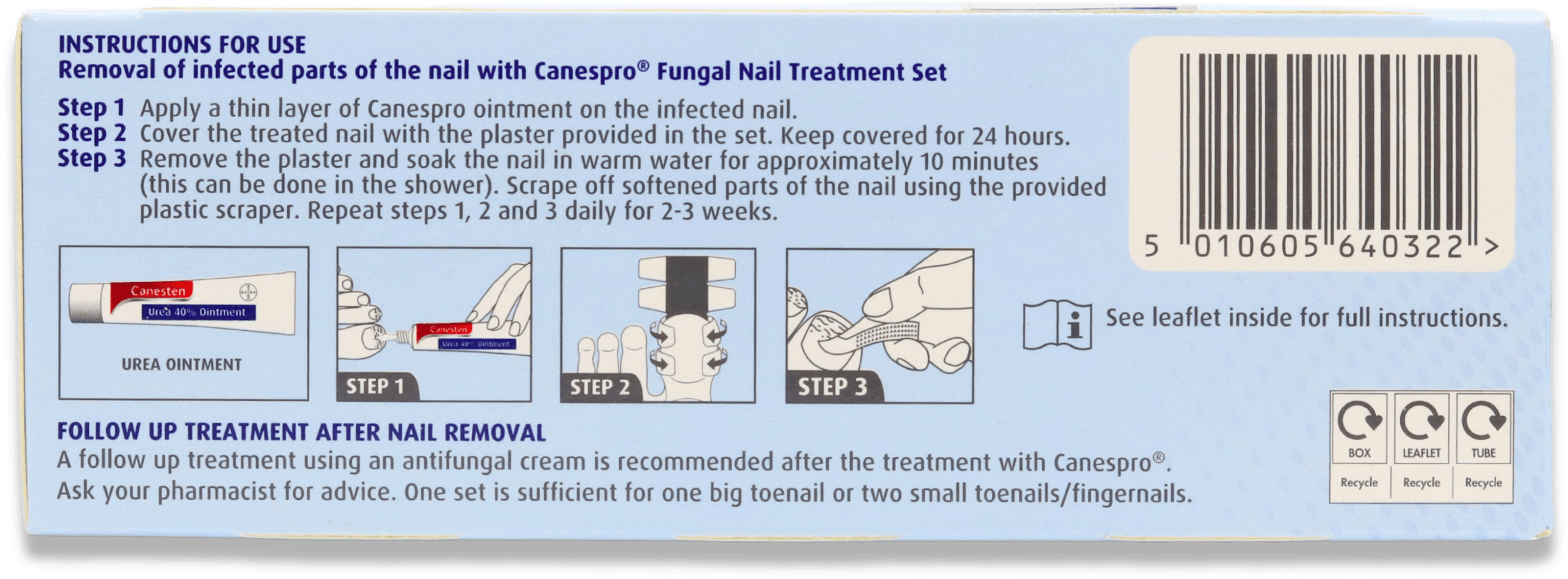 Canespro is used to treat fungal nail infections, characterized by discolored, thickened, and often split nails.