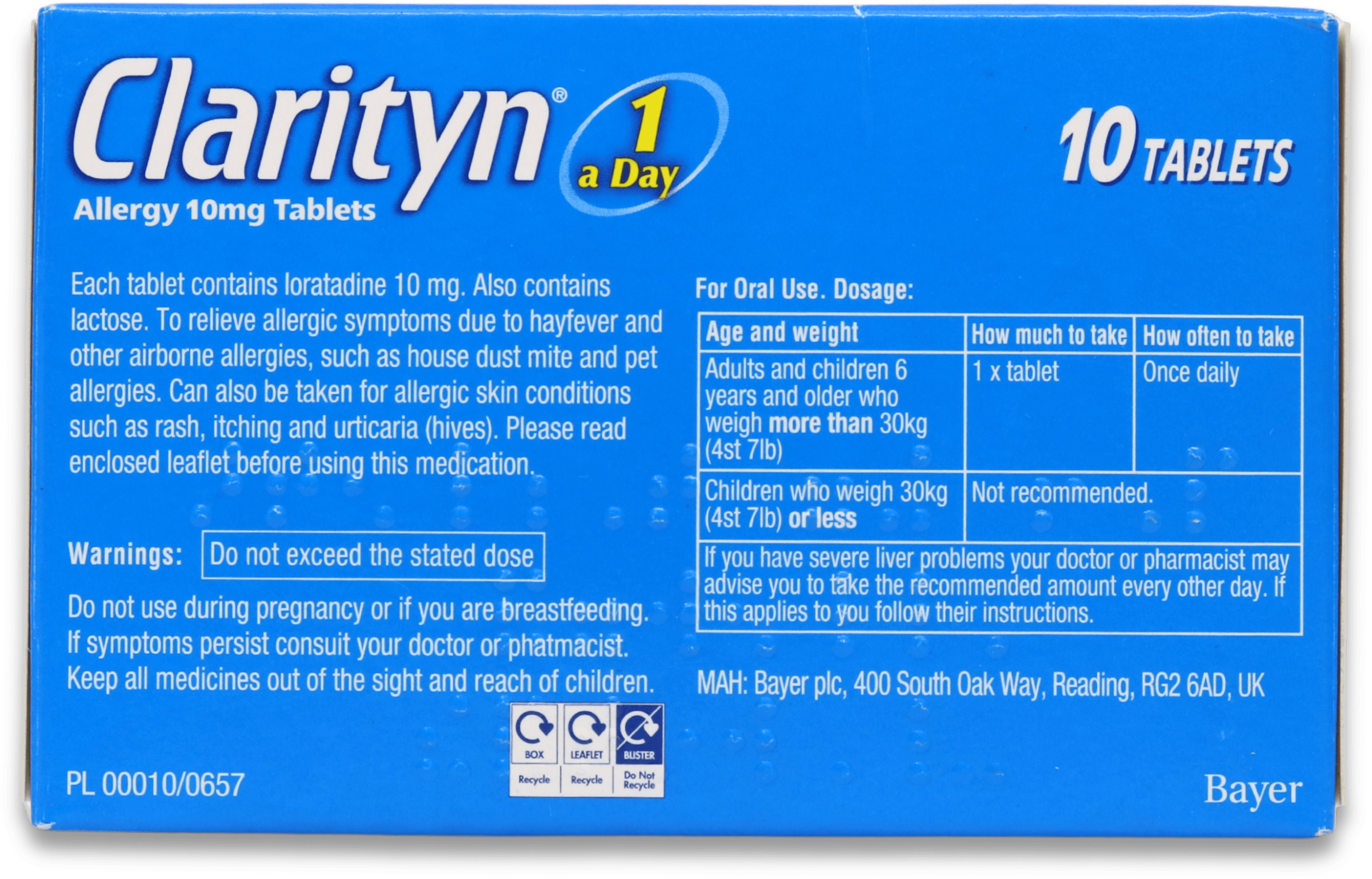- Each tablet contains 10mg loratadine