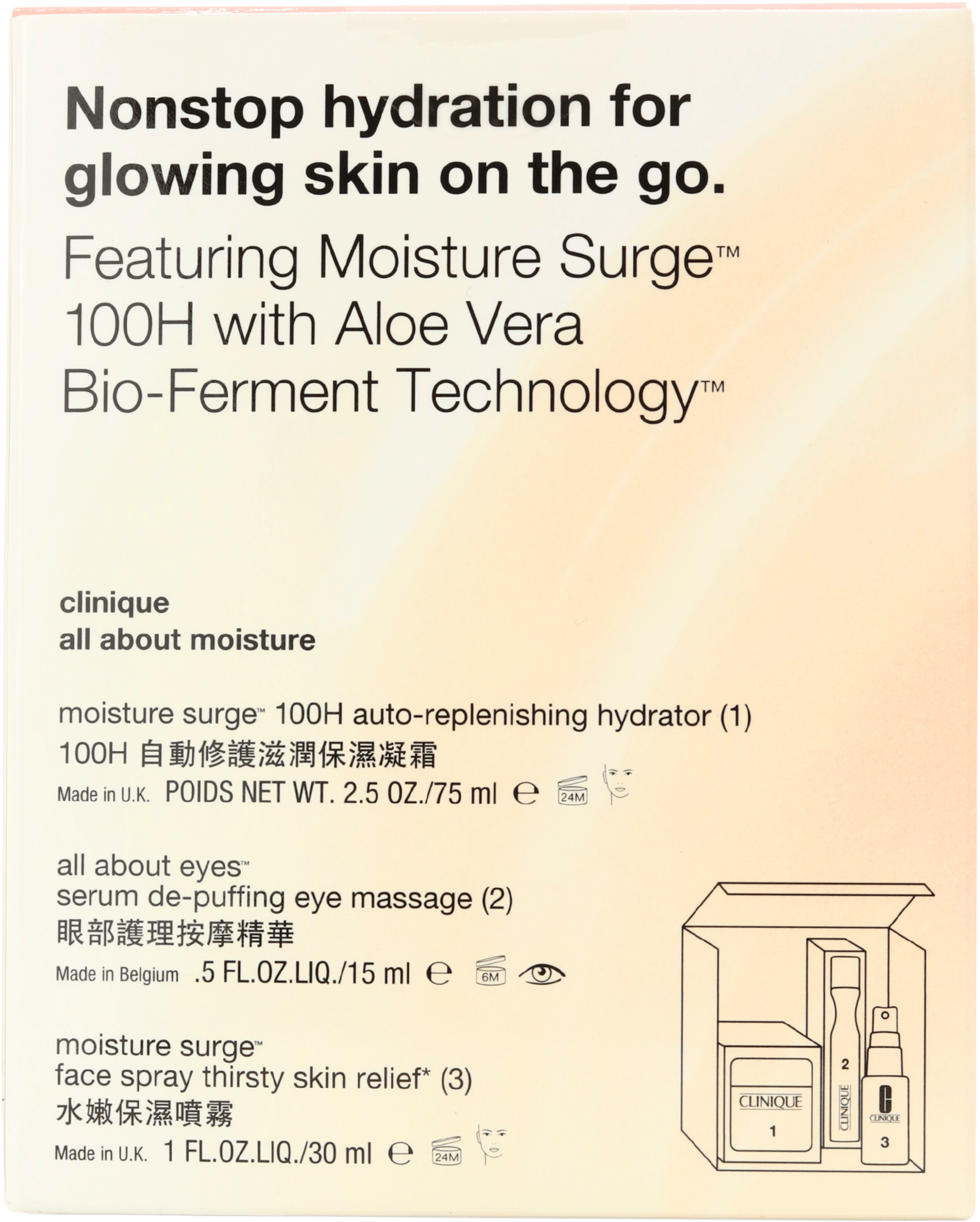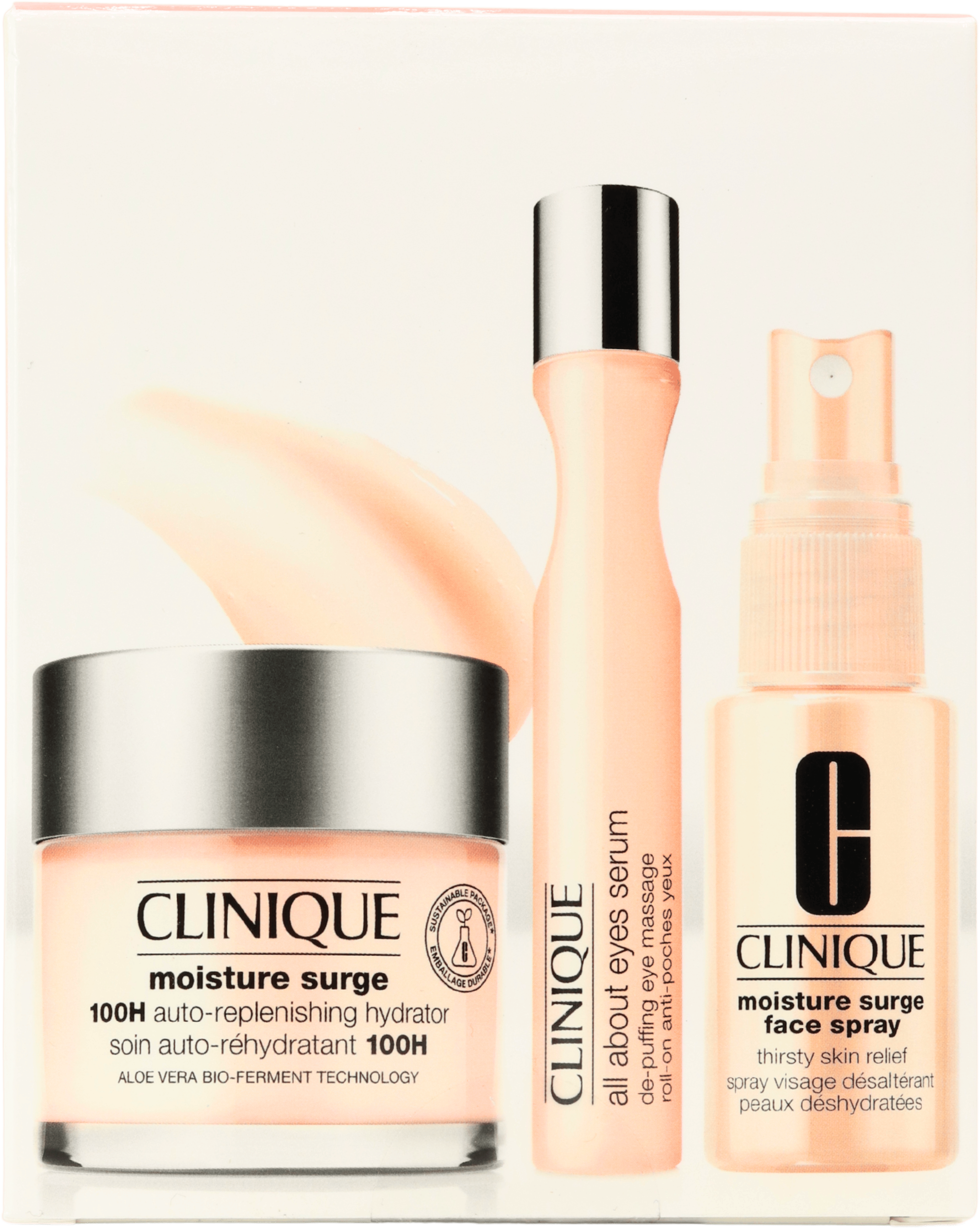 - Multi-level hydrating trio: Set combines a full-size moisturiser, a refreshing Moisture Surge Face Spray and a Moisture Surge Lip Hydro-Plump Treatment to hydrate face and lips, helping to smooth fine dryness lines and support a healthy glow.