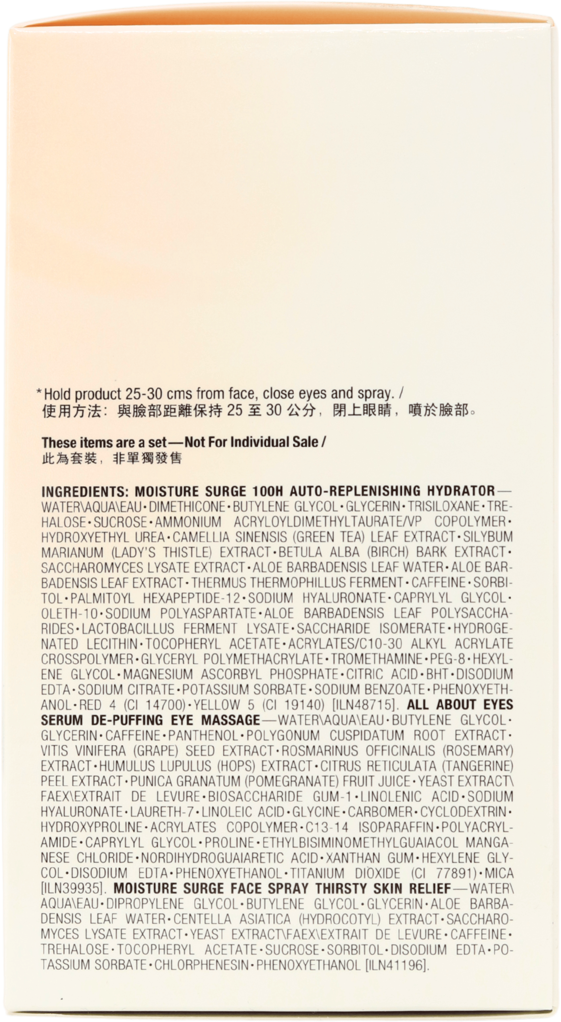 The set includes Moisture Surge 100H Auto-Replenishing Hydrator 75ml, Moisture Surge Face Spray Thirsty Skin Relief 30ml and All About Eyes Depuffing Serum 15ml. This combination gives you a complete mini hydrating routine for face and lips, suitable for daily use and handy for travel or the gym.