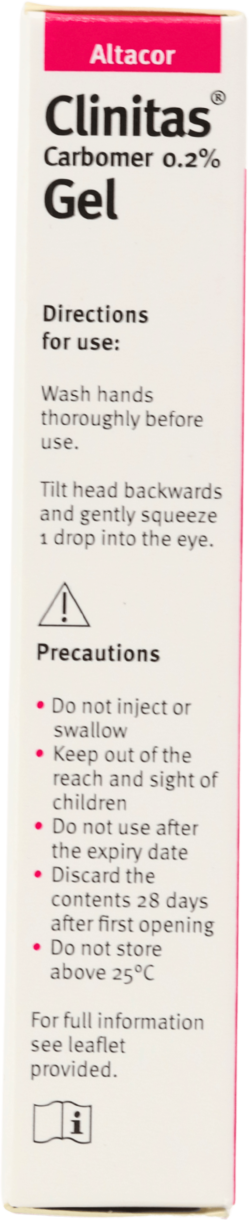 Clinitas Carbomer Gel works by creating a lubricating film over the surface of the eye, which helps to hydrate and soothe the eye. Its blend of ingredients helps to reduce symptoms of dry eye, by locking in moisture and providing hydration to the eye.