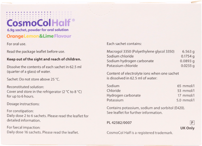 Faecal impaction: Before you take CosmoCol® Half for faecal impaction, your doctor must check to confirm that you have this condition. The recommended dose is 16 sachets daily, all of which should be consumed within 6 hours.