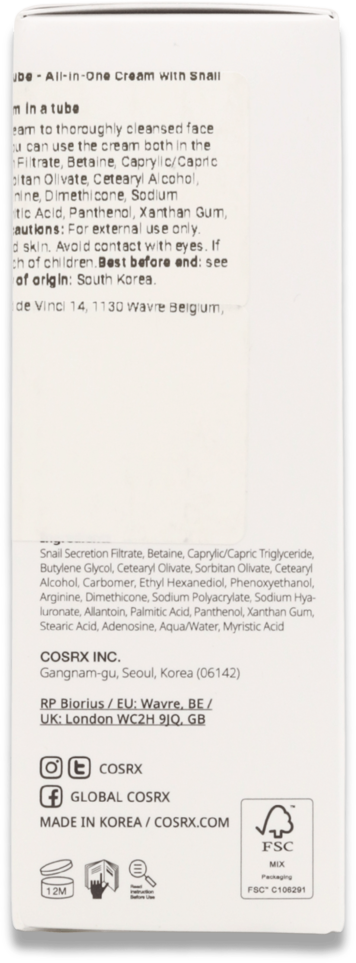 Snail Secretion Filtrate, Betaine, Caprylic/Capric Triglyceride, Butylene Glycol, Cetearyl Olivate, Sorbitan Olivate, Cetearyl Alcohol, Carbomer, Ethyl Hexanediol, Phenoxyethanol, Arginine, Dimethicone, Sodium Polyacrylate, Sodium Hyaluronate,Allantoin, Palmitic Acid, Panthenol, Xanthan Gum, Stearic acid, Adenosine, Water, Myristic Acid