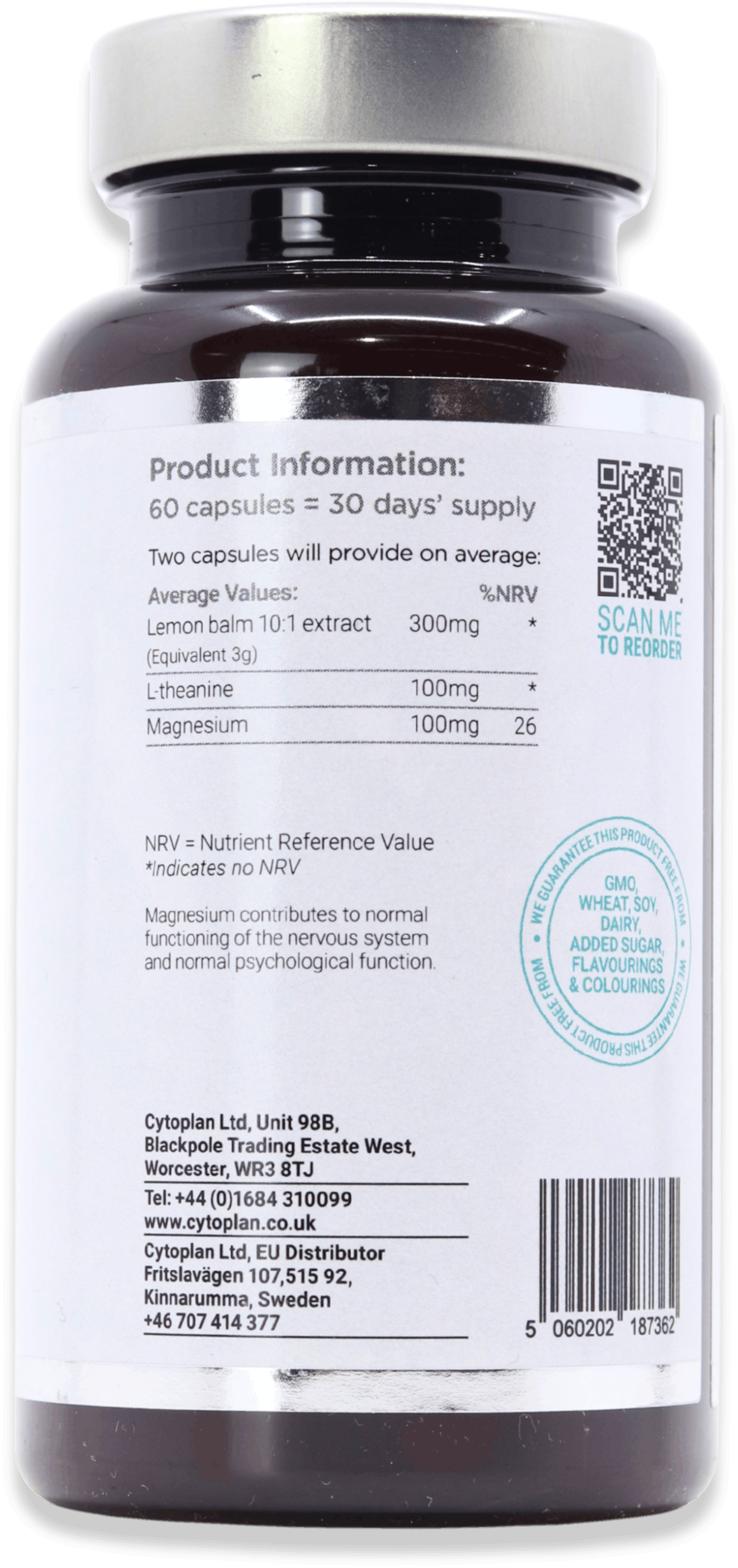 Magnesium taurate, lemon balm extract (Melissa officinalis leaf and stem), magnesium bisglycinate, capsule shell (hydroxypropyl methylcellulose), L-theanine (Camellia sinensis powder).