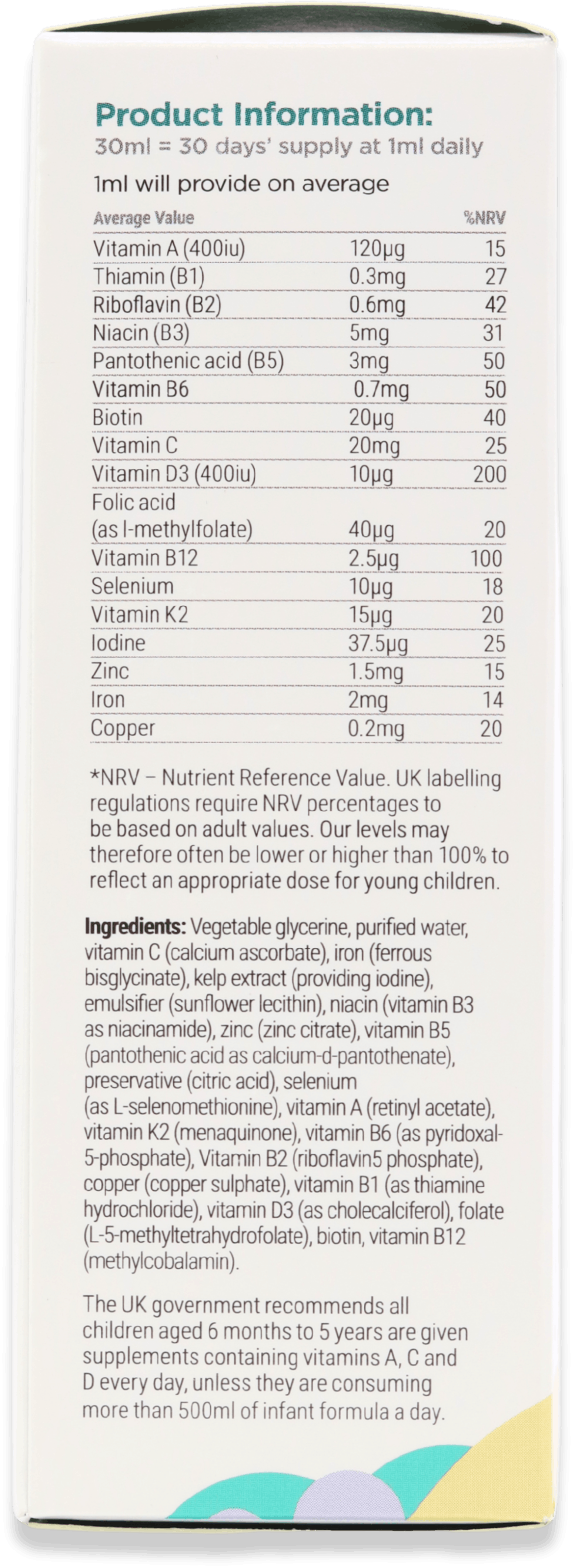 Vegetable glycerine, purified water, vitamin C (calcium ascorbate), iron (ferrous bisglycinate), kelp extract (providing iodine), emulsifier (sunflower lecithin), niacin (vitamin B3 as niacinamide), zinc (zinc citrate), vitamin B5 (pantothenic acid as calcium-d-pantothenate), preservative (citric acid), selenium (as L-selenomethionine), vitamin A (retinyl acetate), vitamin K2 (menaquinone), vitamin B6 (as pyridoxal-5-phosphate), vitamin B2 (riboflavin-5-phosphate), copper (copper sulphate), vitamin B1 (as thiamine hydrochloride), vitamin D3 (as cholecalciferol), folate (L-5-methyltetrahydrofolate), biotin, vitamin B12 (methylcobalamin).