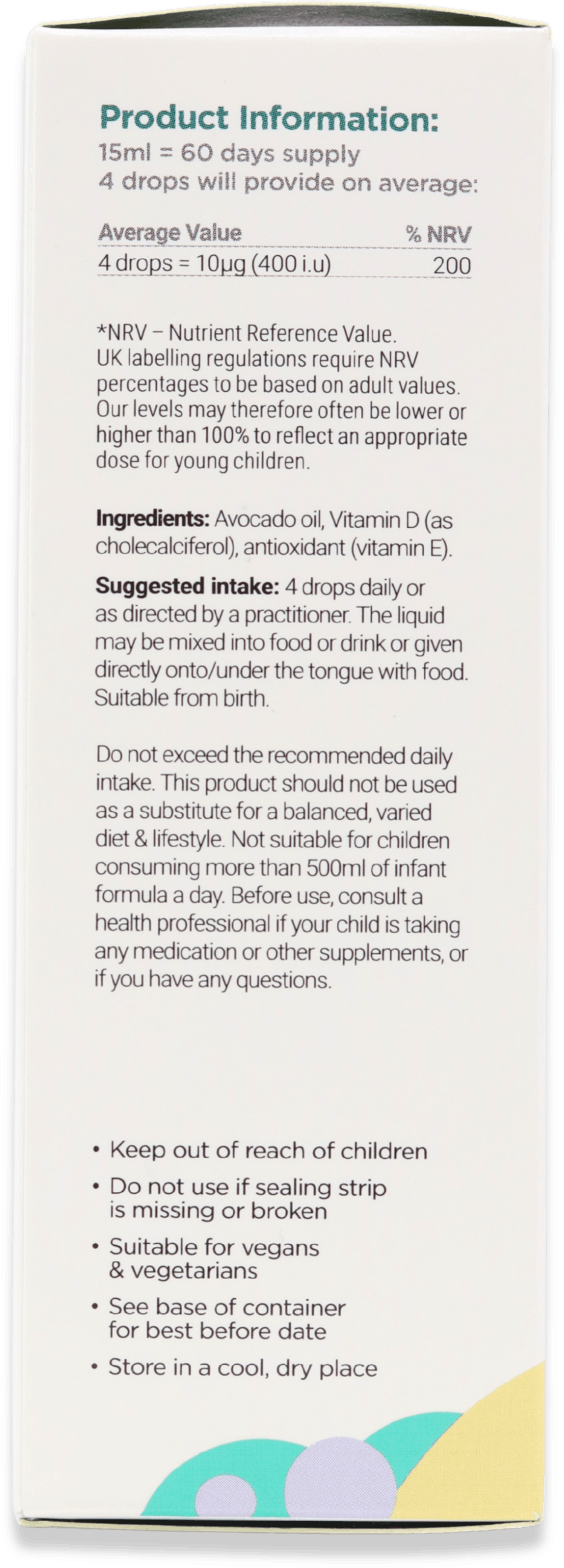 These drops are suitable for babies from birth, older children and adults in the same home. They work well for breastfed babies, fussy eaters and kids who get little sun. People who follow vegan or vegetarian diets can also use them with confidence.