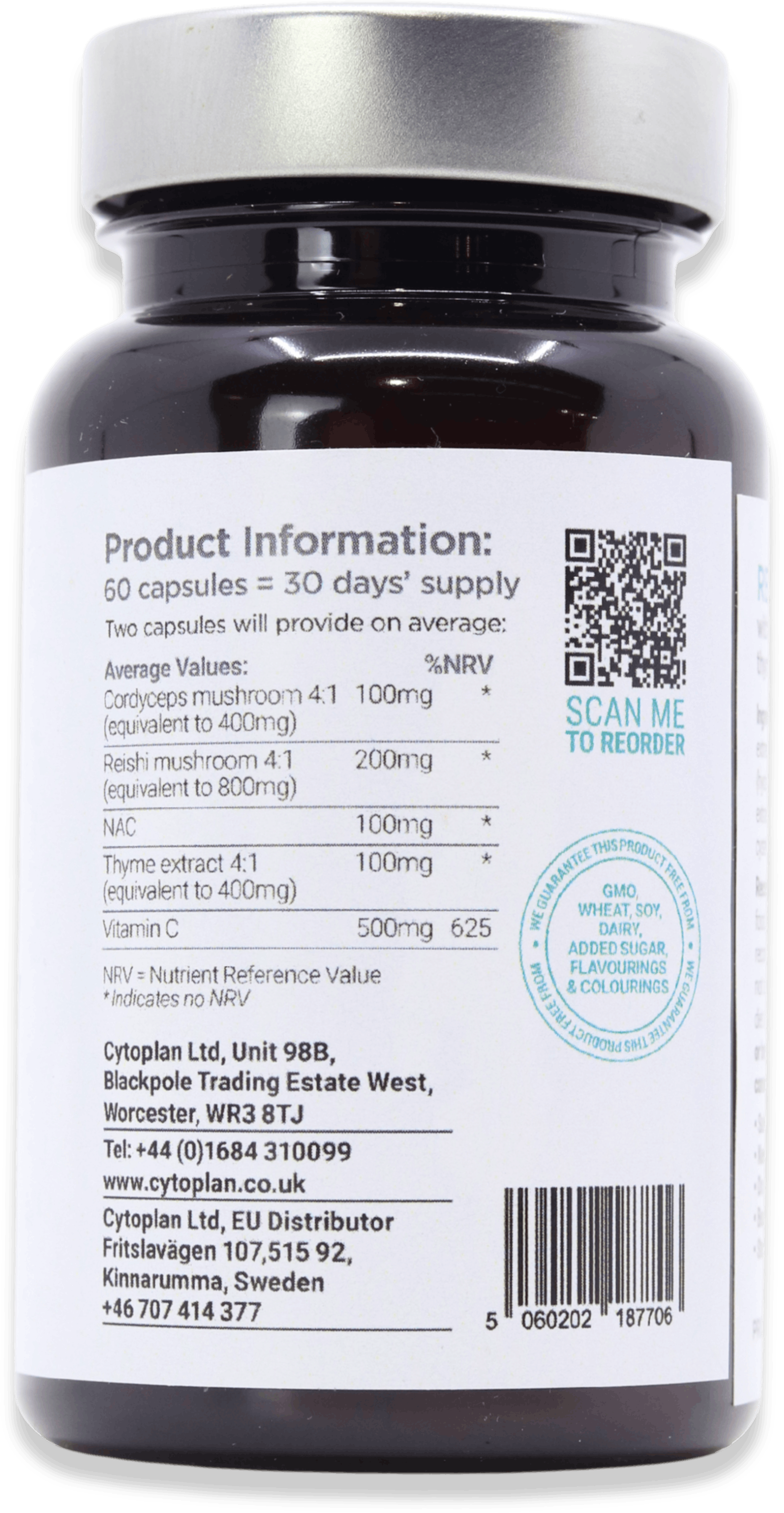 Vitamin C (ascorbic acid), reishi mushroom extract (Ganoderma lucidum fruiting body), capsule shell (hydroxypropyl methylcellulose), cordyceps mushroom extract (Ophiocordyceps sinensis fruiting body), N-acteyl cysteine, thyme extract (Thymus vulgaris leaf).