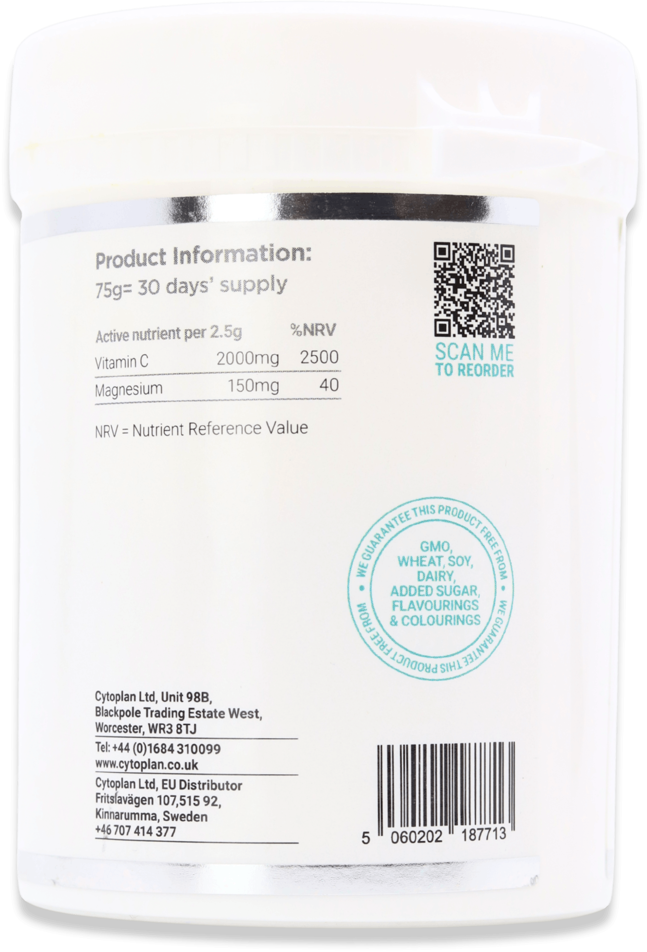 Cytoplan Vitamin C Powder 75g is a gentle, soluble form of vitamin C provided as calcium ascorbate. This form is kinder on the gut than standard ascorbic acid, making it suitable for sensitive stomachs. The fine powder blends easily with water or juice, supporting convenient daily use. It is suitable for adults and older people seeking immune, skin and energy support. Vitamin C contributes to normal immune function, collagen formation and protection of cells from oxidative stress. The powder format is also helpful for those who dislike tablets or prefer flexible dosing.