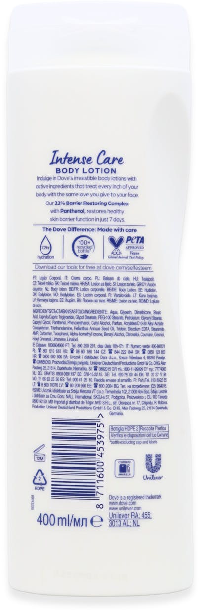 Dove Body Love Intense Care Body Lotion deeply hydrates and nourishes. It restores the skin barrier and locks in moisture for 48 hours.