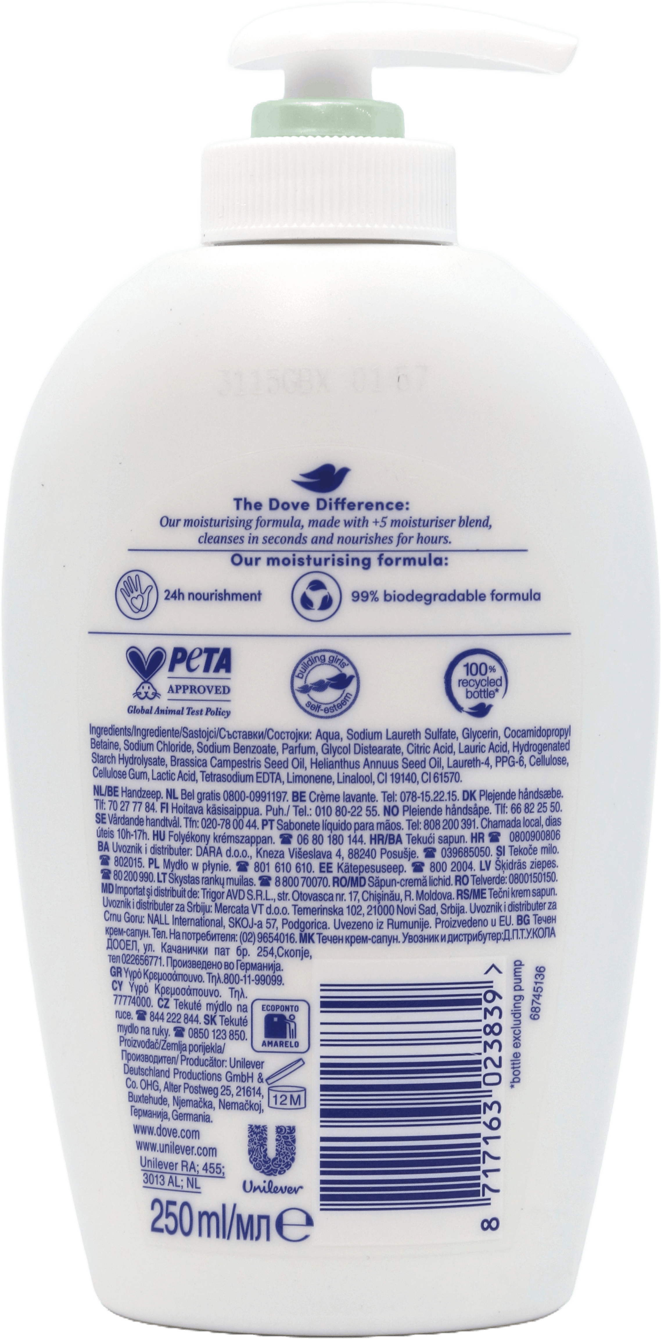 Dove Liquid Hand Soap Cucumber 250ml cleanses and leaves hands feeling soft and smooth. Its hydrating formula is suitable for daily use.
