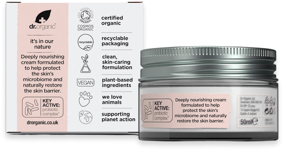 Dr. Organic Skin Calm Probiotic Concentrated Cream is a 50ml elixir designed for individuals seeking relief from skin discomfort, providing up to 24 hours of intense moisturisation. Ideal for those with sensitive skin, it offers soothing and protective care. Its formulation is based on the understanding of the gut-skin axis, highlighting the role of probiotics in skin health, making it a scientifically informed choice for skincare.