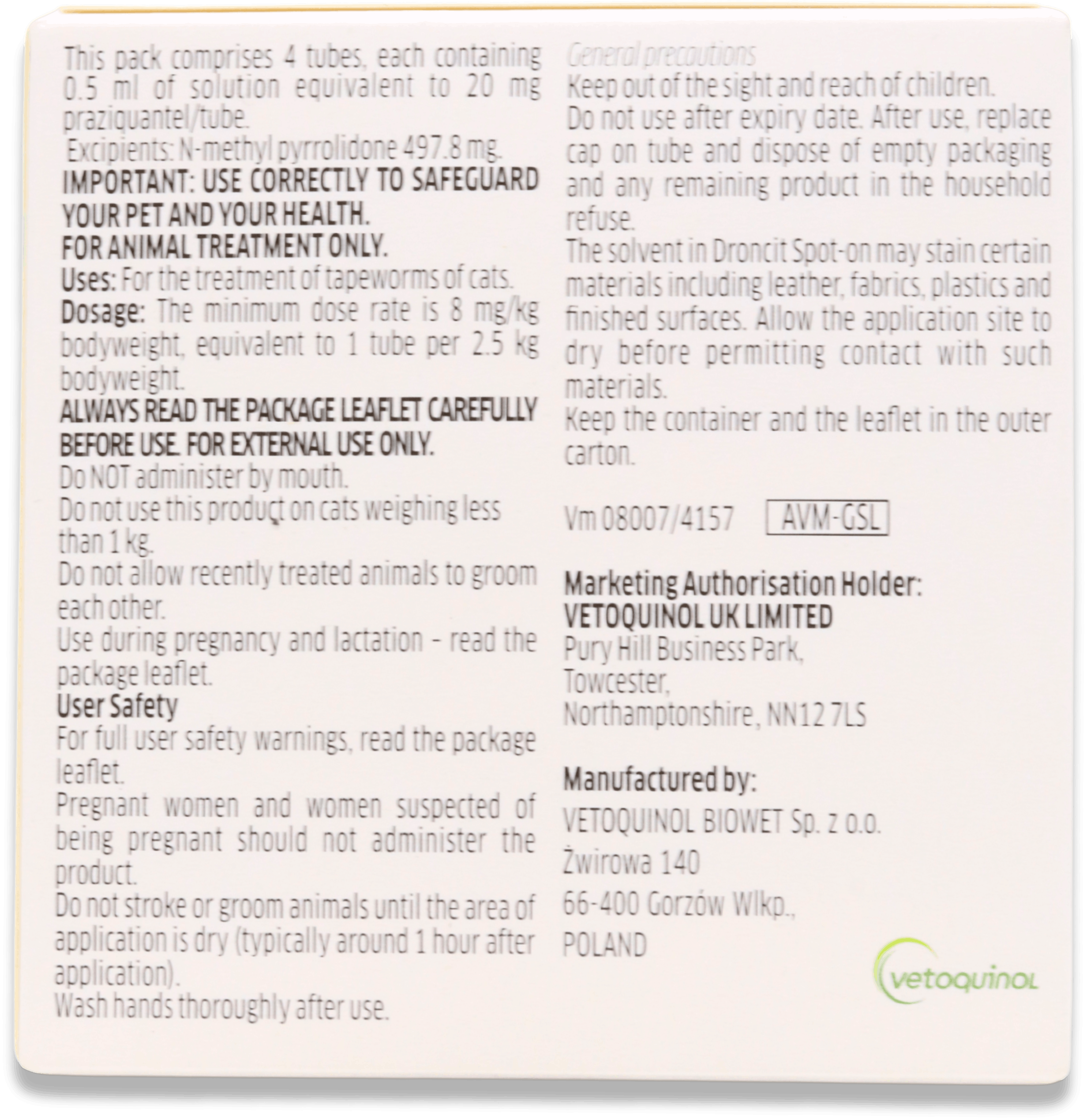 Droncit Spot on 0.5ml for Cats 4 Pack treats tapeworms in cats.