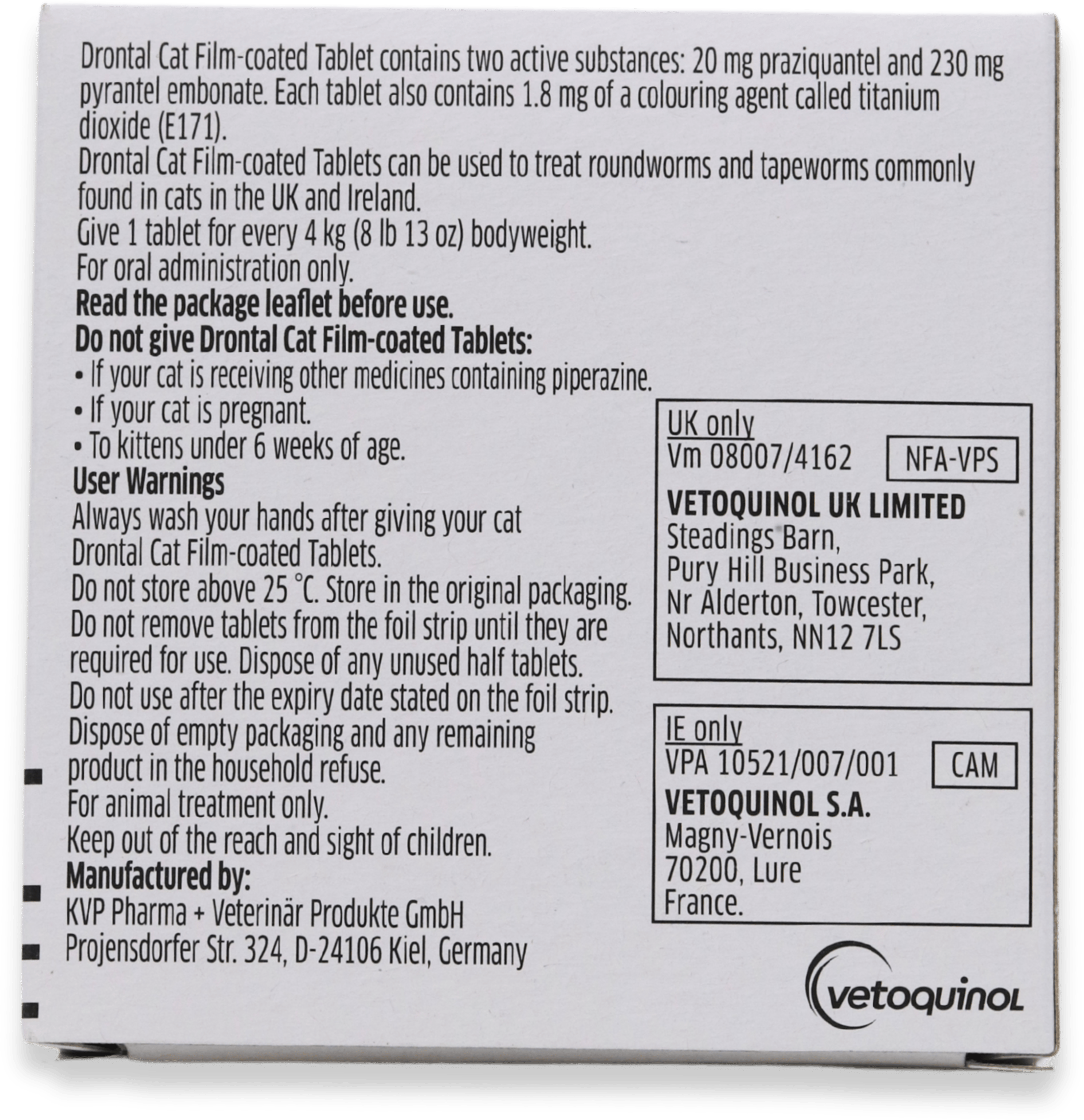 Each tablet contains 20 mg Praziquantel and 230 mg Pyrantel Embonate.