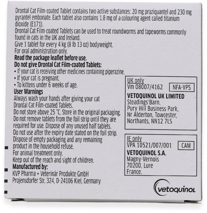 Drontal Cat Tablets 2 Pack is an ideal choice for cat owners seeking a reliable deworming solution. These tablets are highly effective against a variety of intestinal worms, including roundworms and tapeworms. Formulated with 20 mg Praziquantel and 230 mg Pyrantel Embonate, Drontal Cat Tablets ensure your pet's health is safeguarded. They are appropriate for cats and kittens over 6 weeks old and can be administered with or without food.