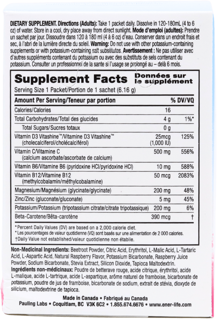 Vitamin D (Cholecalciferol) 23mcg (1000iu) 125%, Vitamin C (Calcium Ascorbate) 500mg 556%, Potassium (Citrate) 200mg 4%, Magnesium (Glycinate) 200mg 48%, Vitamin B12 50mcg 2083%, Vitamin B6 10mg 588%,Zinc (Gluconate) 5mg 45%, Vitamin A (as Beta Carotene) 195mcg 650iu 22%, Natural Raspberry Juice Powder, Beetroot Powder, Erythritol, Tapioca Maltodextrin, Purified Stevia Leaf Extract, Citric Acid, Potassium Bicarbonate, Sodium Bicarbonate, DL-Malic Acid, L-Tartaric Acid, Natural Raspberry Flavor, Silicon Dioxide, Natural Citrus Flavor, L-Aspartic Acid.