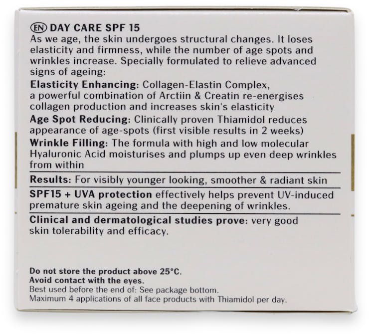 The cream is formulated with patented Thiamidol to reduce age-spots, Hyaluron to plump up deep wrinkles, and Collagen-Elastin Complex to enhance skin elasticity. This combination of ingredients addresses advanced signs of ageing and leaves skin looking visibly younger, smoother, and more radiant.