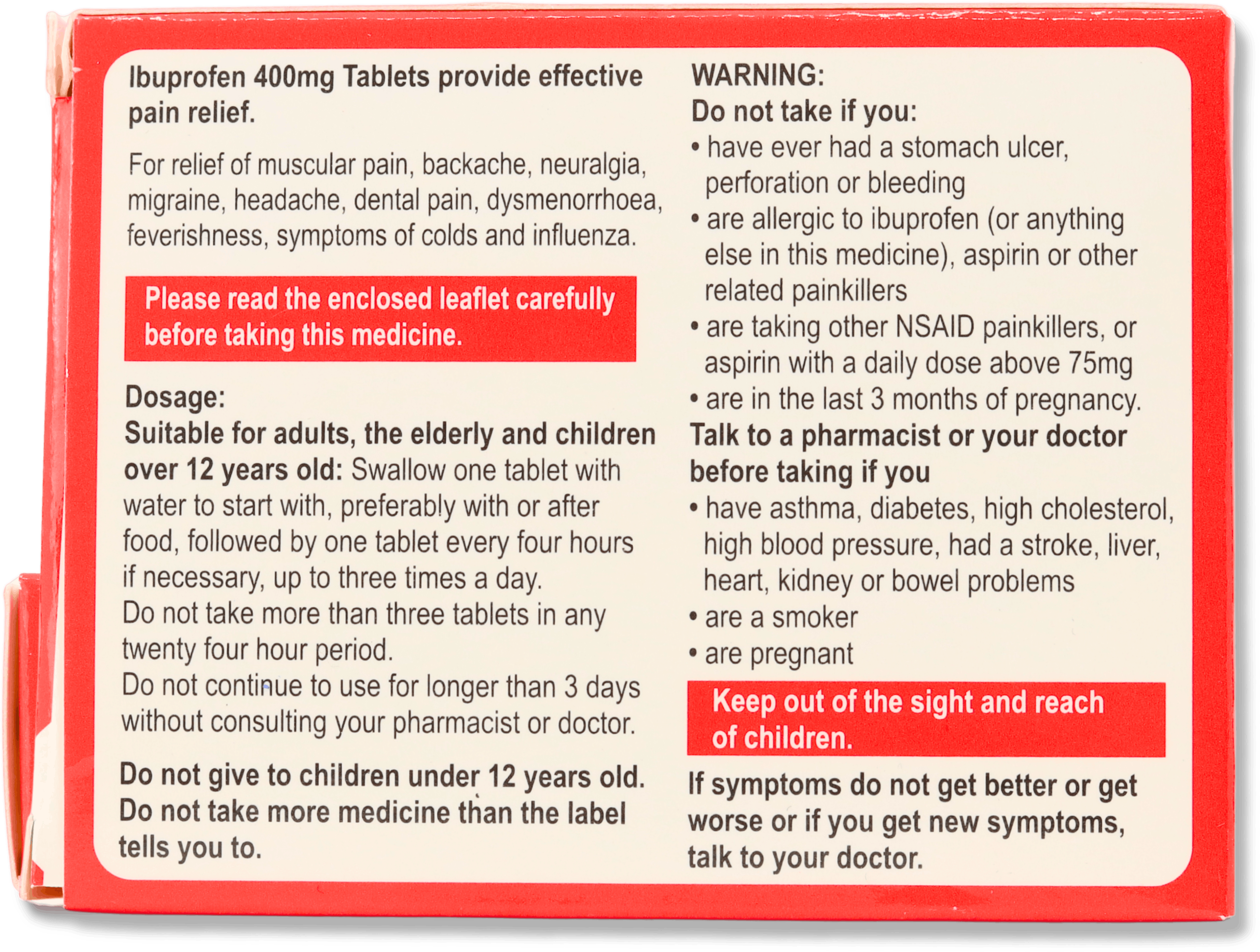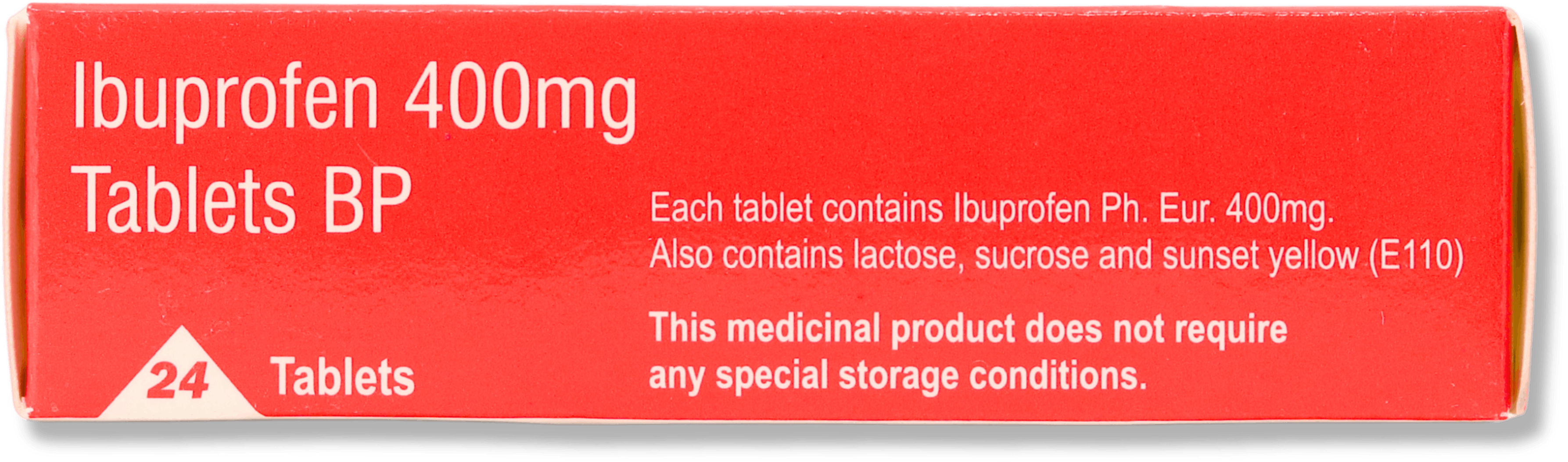 Active ingredient: Ibuprofen 400 mg per tablet.