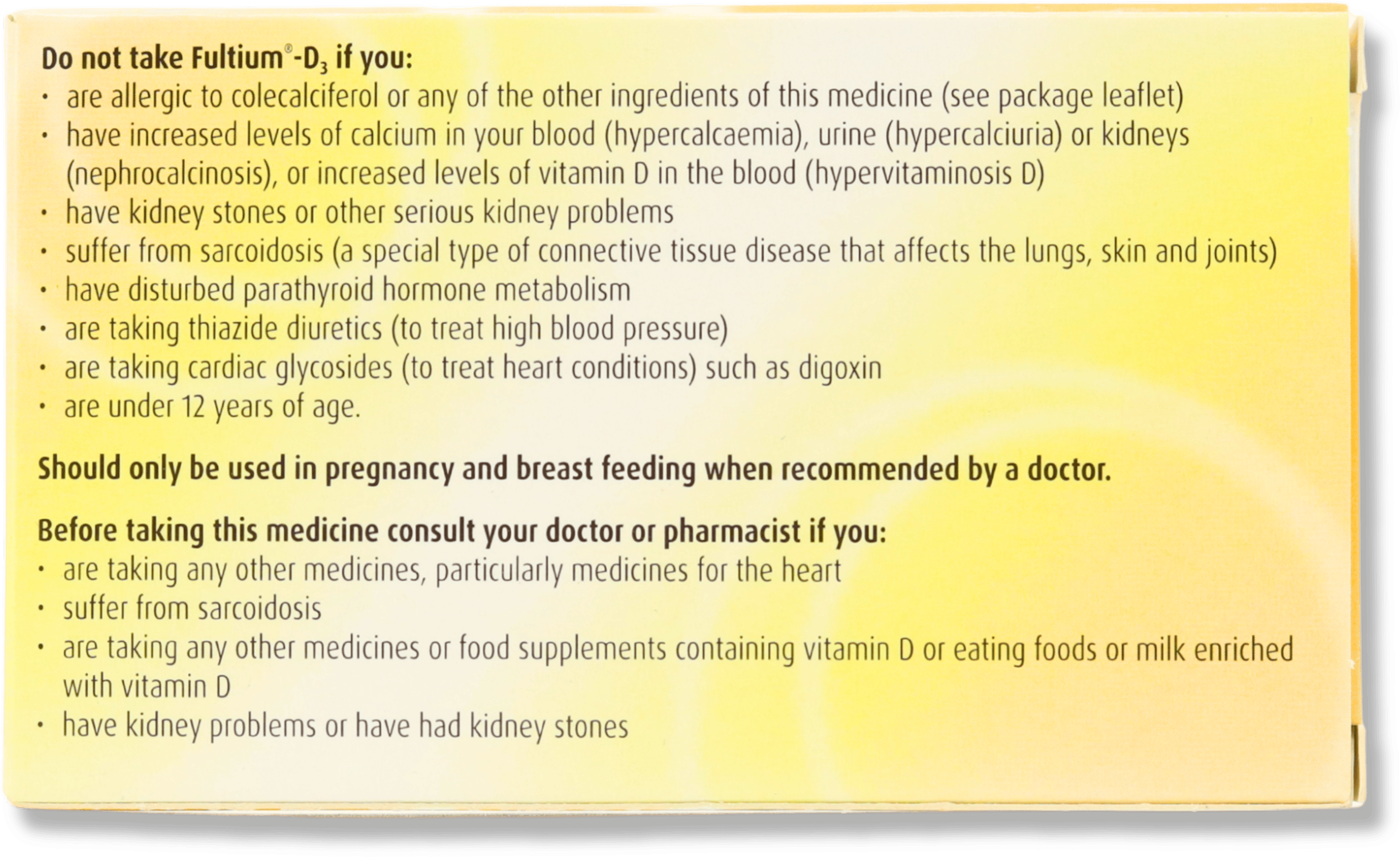 - Thiazide diuretics, cardiac glycosides (e.g. digoxin), corticosteroids, or other vitamin D supplements