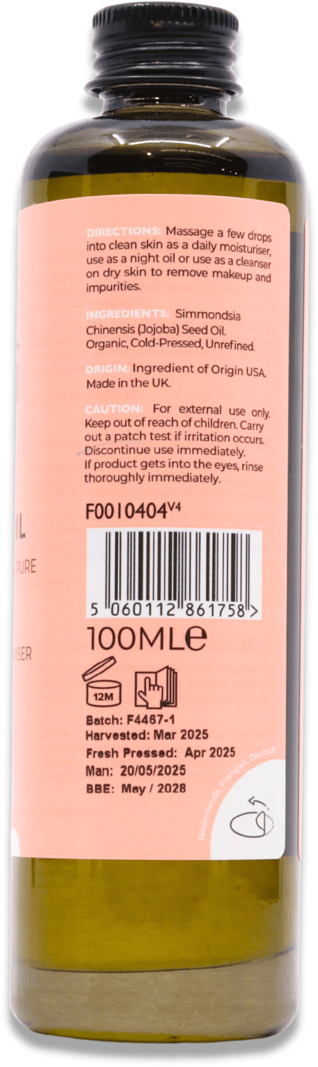 Simmondsia Californica, Golden Jojoba Oil. Origin: USA. This is a cold-pressed, non-standardised, unrefined, organic and natural oil.