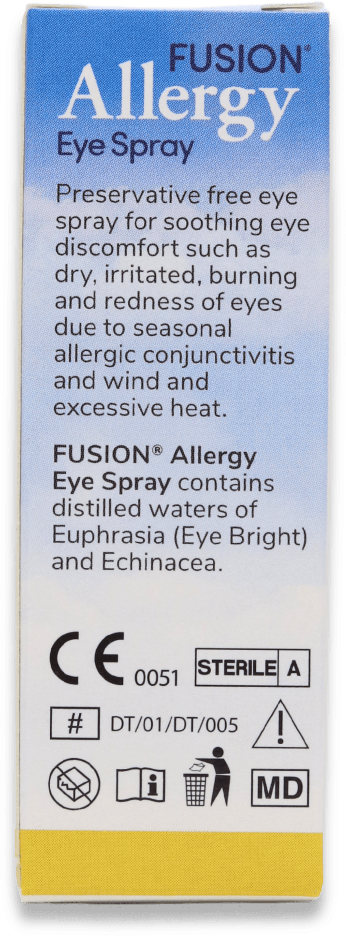 Fusion Allergy Eye Spray is a preservative-free eye spray that provides treatment and care for dry, irritated, or inflamed eyes and eyelids due to allergic conjunctivitis (Hay fever).