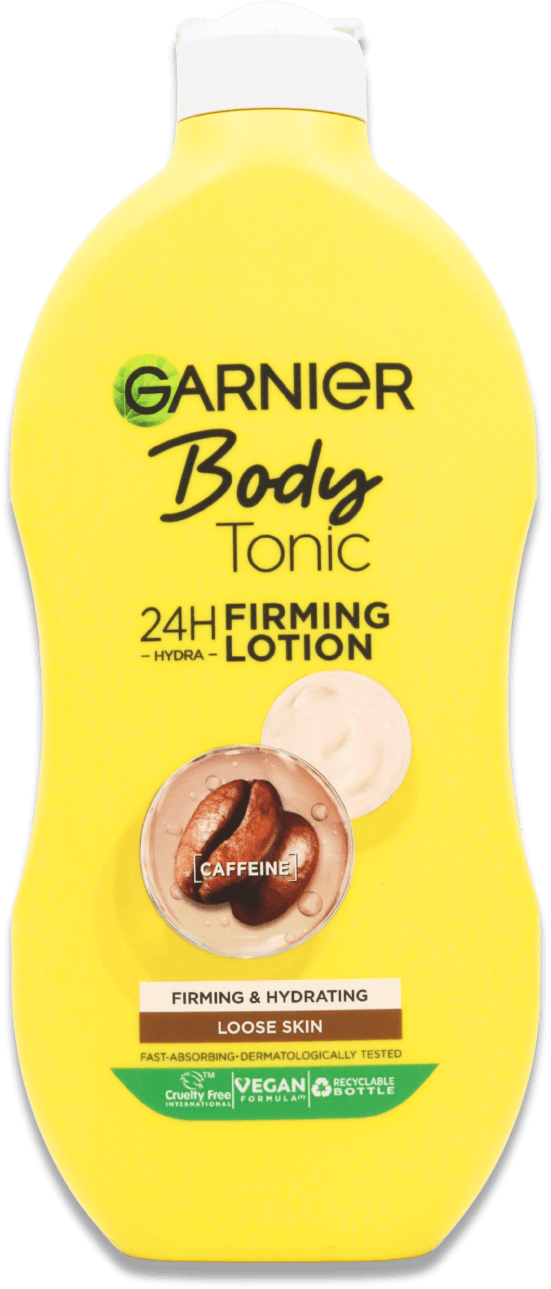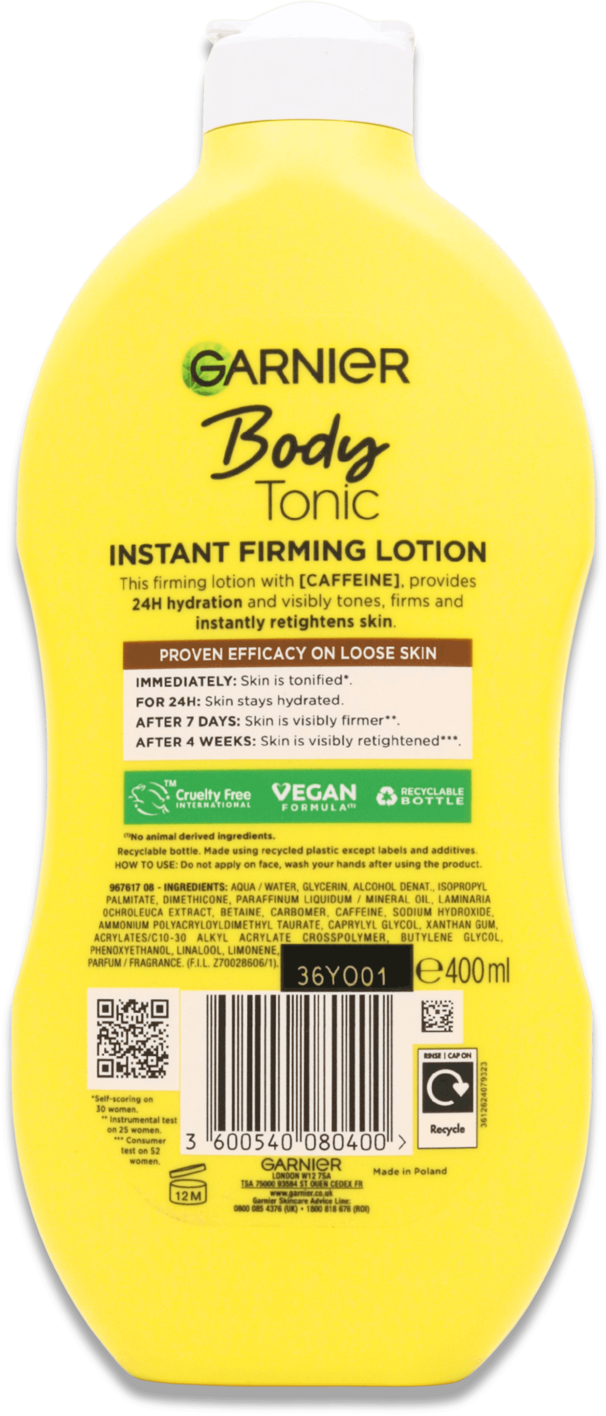 Garnier Body Tonic Firming Lotion 400ml helps restore bounce and smooth tone to skin that feels dull or slack. When used each day, it deeply hydrates and firms, while easing dry areas. Thanks to its fast-absorbing blend, it leaves skin soft, fresh, and not greasy. The mix of Phyto-Caffeine and seaweed extract works to lift skin's natural bounce and surface strength. Many people see a clear difference in just 7 days—skin appears tighter, feels smoother, and shows more glow. Ideal for normal to dry skin, this lotion is also vegan and cruelty-free.