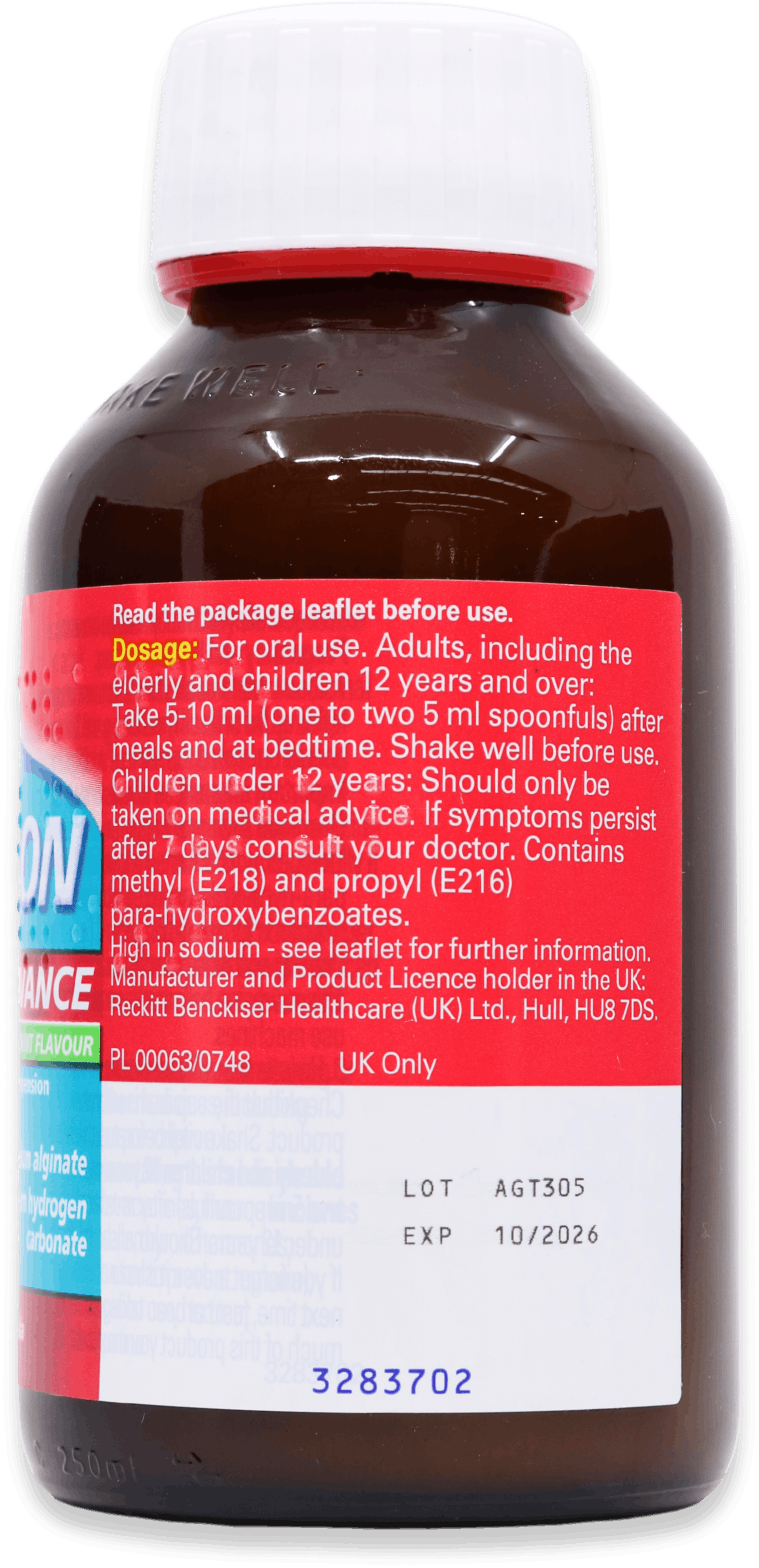 Gaviscon Advance Peppermint Liquid combines sodium alginate with potassium hydrogen carbonate, creating a thick, protective ‘raft’ barrier on the stomach contents. This layer prevents acid from rising into the oesophagus, reducing discomfort and the burning sensation typical of reflux.