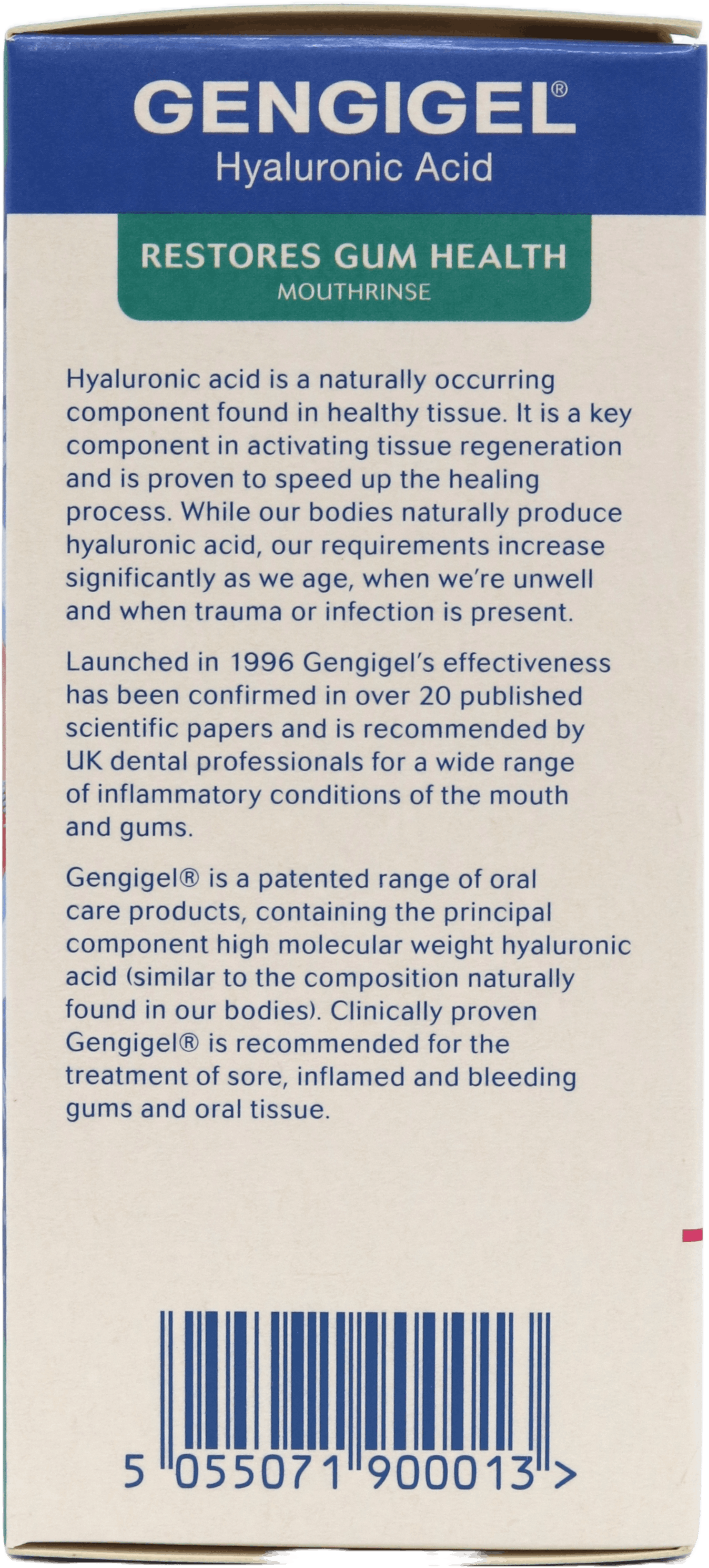 Gengigel Mouthrinse is a unique solution designed for the care of mouth and gums, especially when they are inflamed or receding. Made with hyaluronic acid, commonly found in the body's connective tissues, it encourages the development of new, healthy tissue upon gum contact. This mouth rinse is appropriate for everyone, and there haven't been any reported negative reactions or contraindications.
