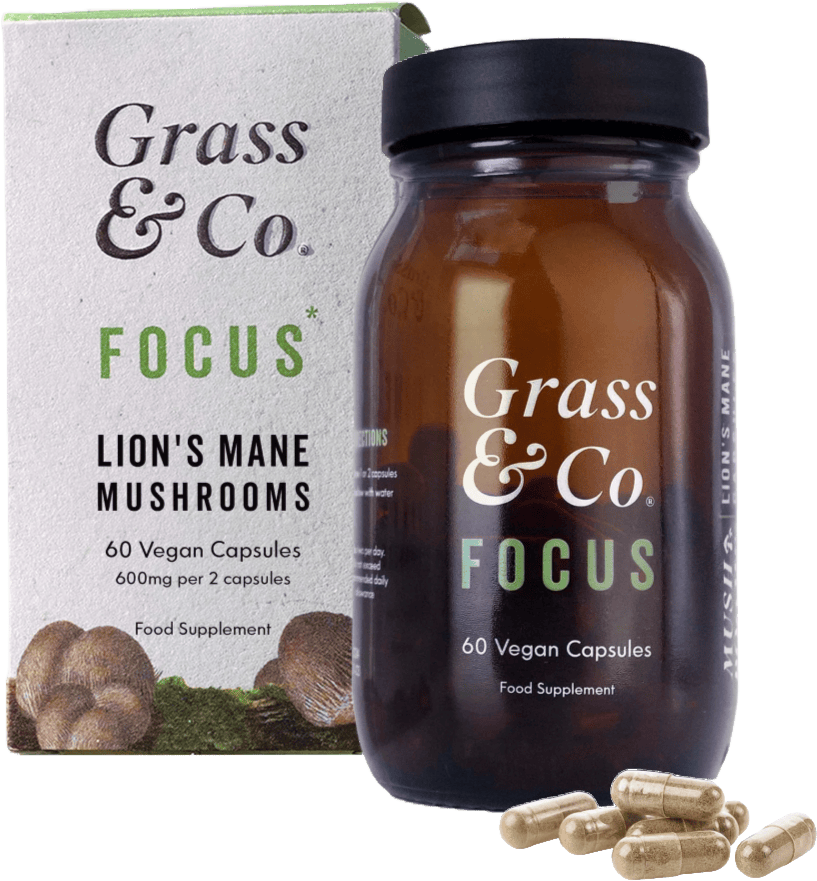 Grass & Co Focus Lion's Mane 60 Capsules is a vegan supplement that combines organic Lion's Mane mushroom extract with adaptogens, designed for individuals looking to enhance their daily mental focus and clarity. Ideal for students and busy professionals, this supplement offers a convenient way to support psychological function and combat tiredness. Each serving contains 600mg of full-spectrum Lion's Mane sourced from fruiting bodies, along with Ginseng, Omega-3, and Vitamin B12.