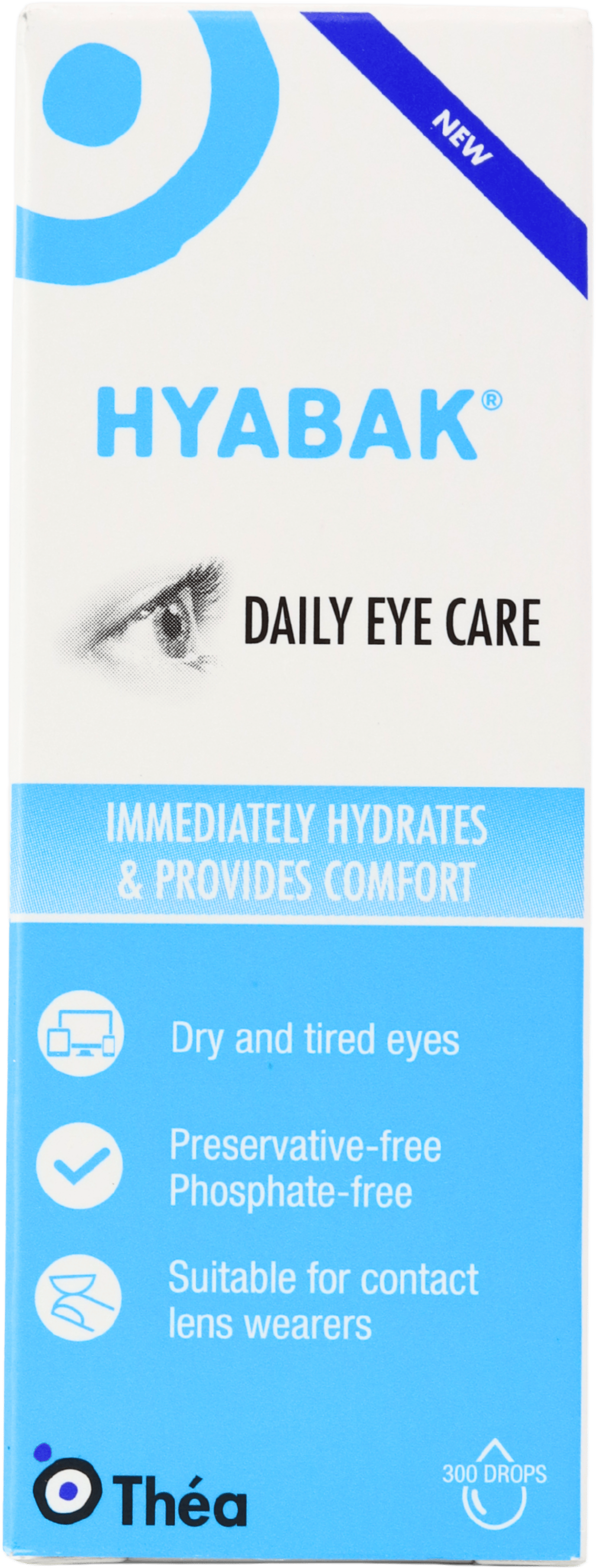 Hyabak Daily Eye Care Eye Drops 10ml are preservative-free lubricating drops designed to soothe dry, irritated or tired eyes while supporting long-lasting hydration and comfort throughout the day. They suit people who experience dryness from screen time, air conditioning, air travel or environmental factors, as well as contact lens wearers needing extra moisture and easier lens handling. The formula contains 0.15% sodium hyaluronate, a hydrating tear lubricant that helps restore the tear film, reduce grittiness and relieve discomfort. Hyabak is suitable for adults, children and contact lens users seeking reliable everyday eye care.