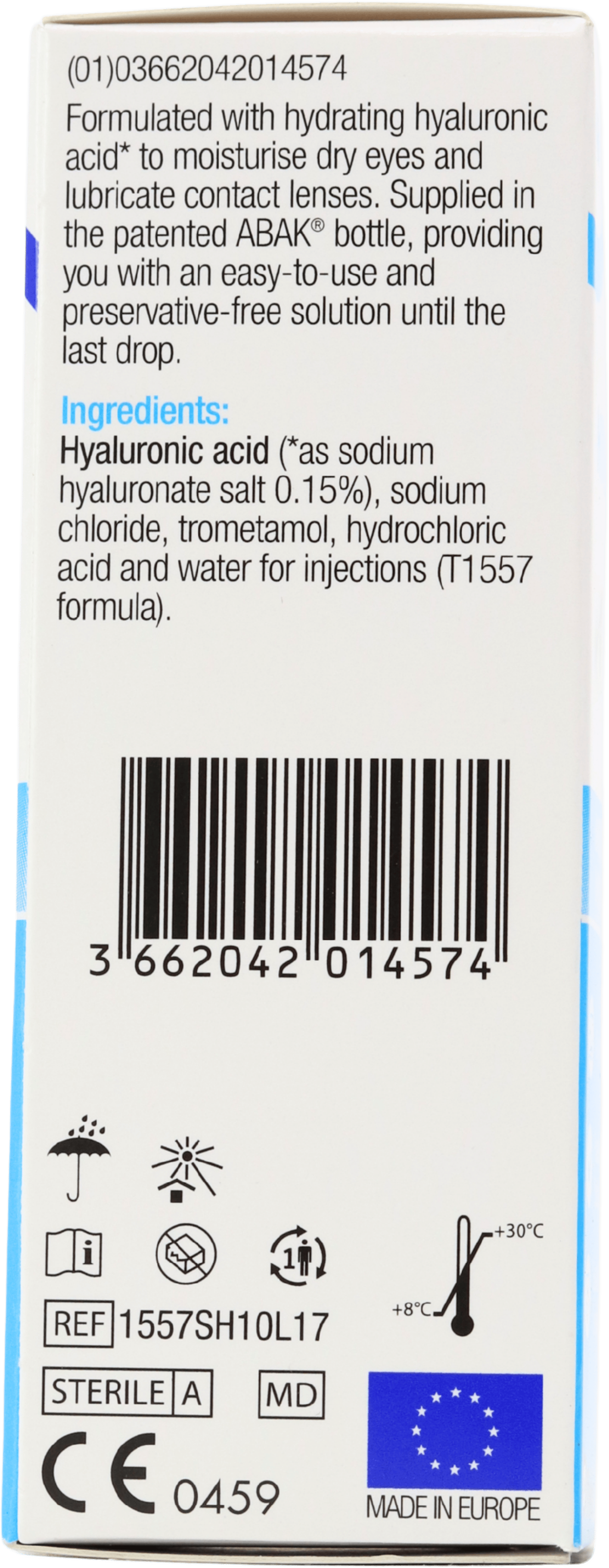 Hyabak combines 0.15% sodium hyaluronate with a preservative-free hypotonic solution designed to support the natural tear film and improve eye comfort. Alongside the advanced ABAK bottle and compatibility with contact lenses, this gives a long-lasting moisturising effect compared with many conventional multi-dose drops that contain preservatives.