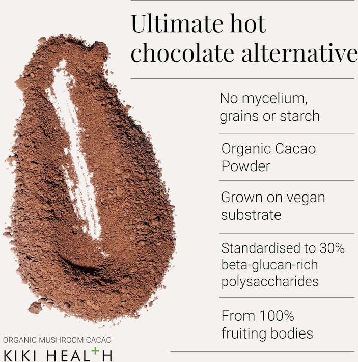 - KIKI Health Organic Mushroom Extract Cacao Powder 105g is a well-balanced alternative to hot chocolate