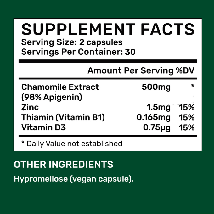 Chamomile extract (of which at least 98% Apigenin), zinc, thiamin (Vitamin B1), vitamin D, vegan HPMC capsule coating.