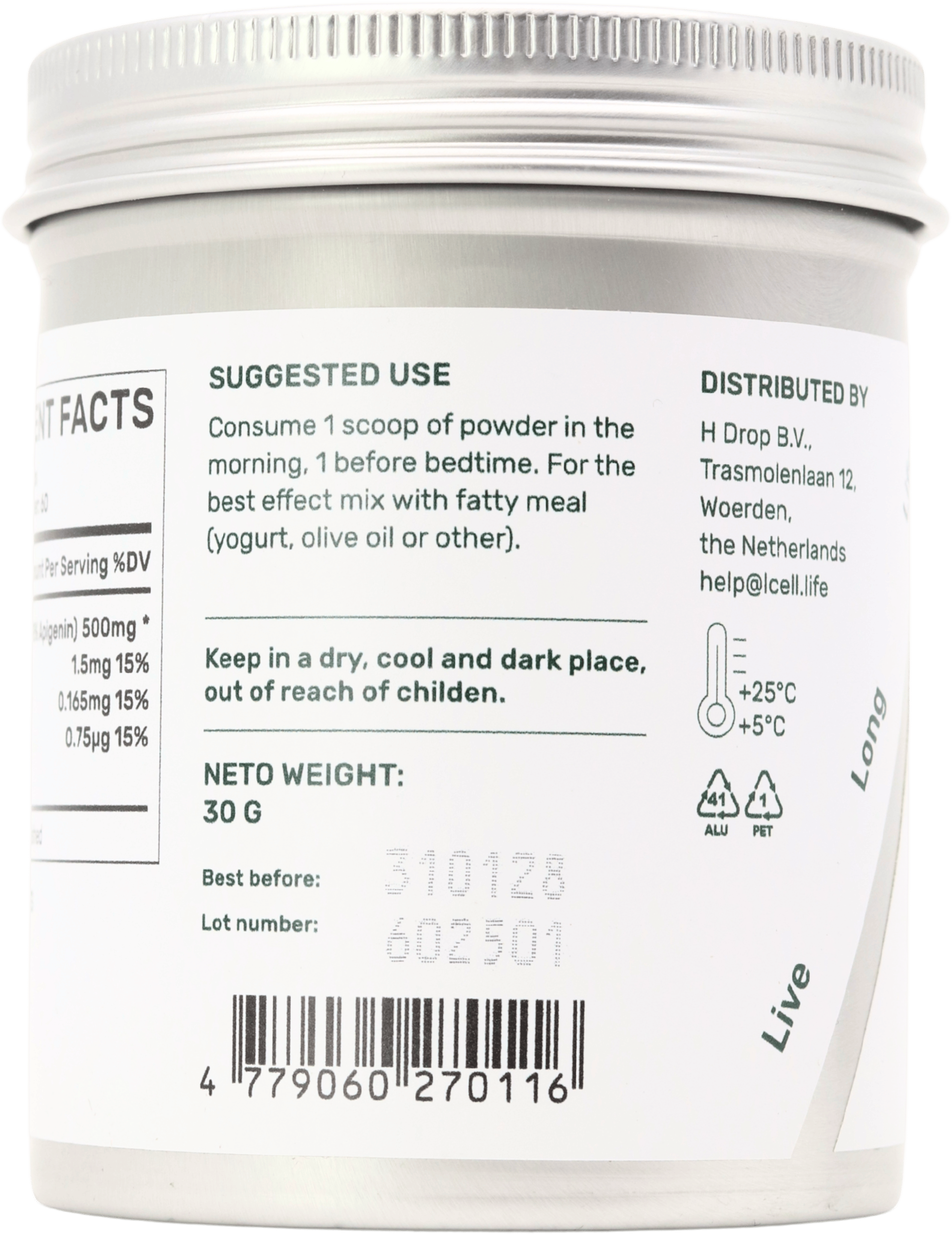 L-Cell focuses on high-purity apigenin sourced from chamomile, manufactured in pharma-grade European facilities with ISO-level quality systems and regular laboratory testing for safety and active content. In contrast with many capsule-based products, this neutral-tasting powder offers flexible dosing, excellent value over a 60+ day period and alignment with L-Cell’s broader longevity-focused, science-driven supplement range.